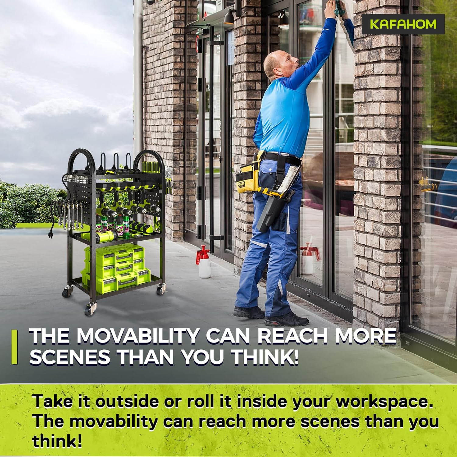 KAFAHOM Power Tool Organizer Cart with Charging Station,Garage Floor Rolling Storage on Wheels for Mechanic,Mobile 8 Drill Holder, Utility Cart with Battery Charging 8 Outlet Power Strip