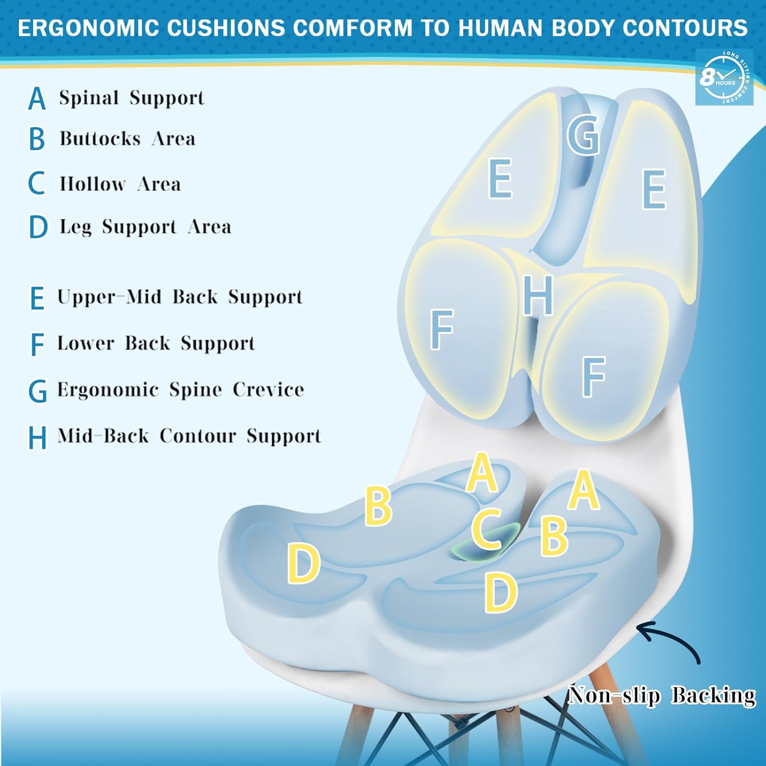 - đ ăThoughtful Design of Seat CushionăOur Seat Cushion comes with ventilated holes on the field of the memory foam core which is conducive to increasing air circulation. Featuring a U-shaped cutout & double concave side wings, this seat pad not only reduces symptoms of hemorrhoids, but also supports the natural curves of the thighs, dispersing pressure on the hips, tailbone, lower back and waist. The anti-slip rubber bottom ensures the optimal position of the seat cushion and prevents sliding.
