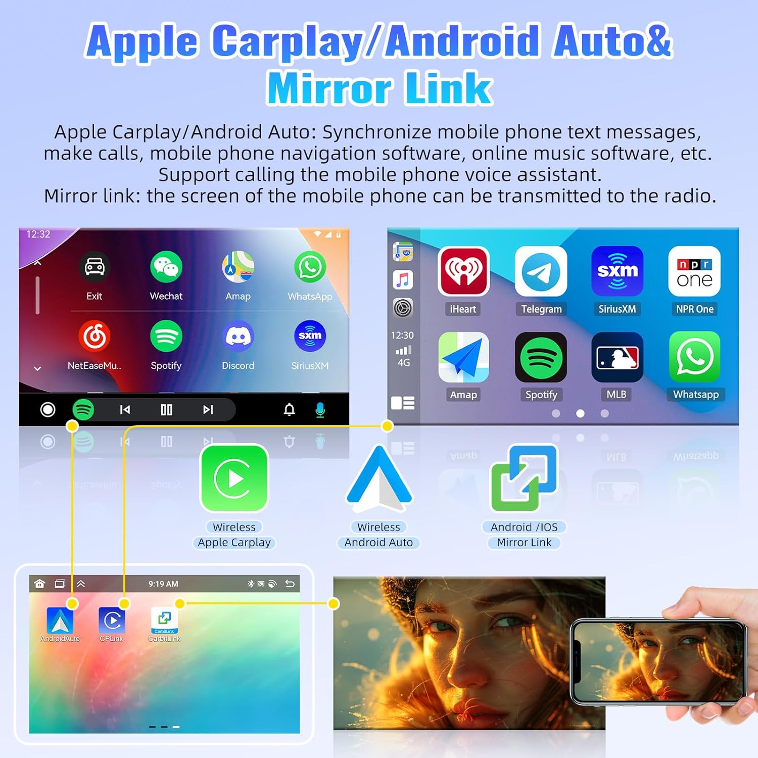 - ăCarplay, Android AutoăThe android radio can synchronize the phonebook, email, notification, map navigation APP, music APP on the phone to the radio, and support call mobile phone voice assistant for voice control. Keep the mobile phone WiFi switch on. Connect Bluetooth, Open the [CPLINK]/[Android Auto] APP to automatically connect. Or use a USB cable to connect the phone and then open the [CPLINK]/[Android Auto] APP.