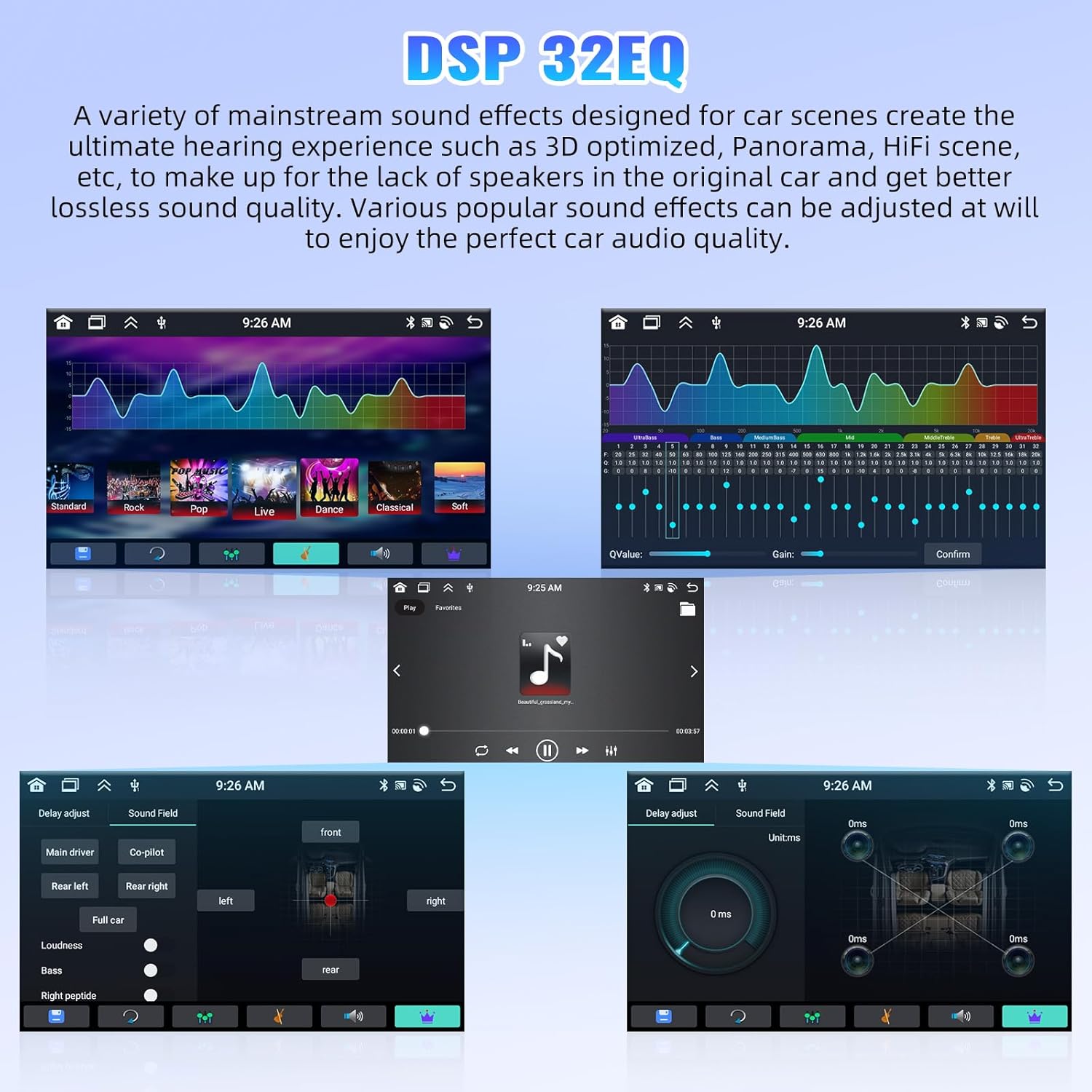 - ăDSP 32EQ ăA variety of mainstream sound effects designed for car scenes create the ultimate hearing experience such as 3D optimized, Panorama, HiFi scene, etc, to make up for the lack of speakers in the original car and get better lossless sound quality. Various popular sound effects can be adjusted at will to enjoy the perfect car audio quality.