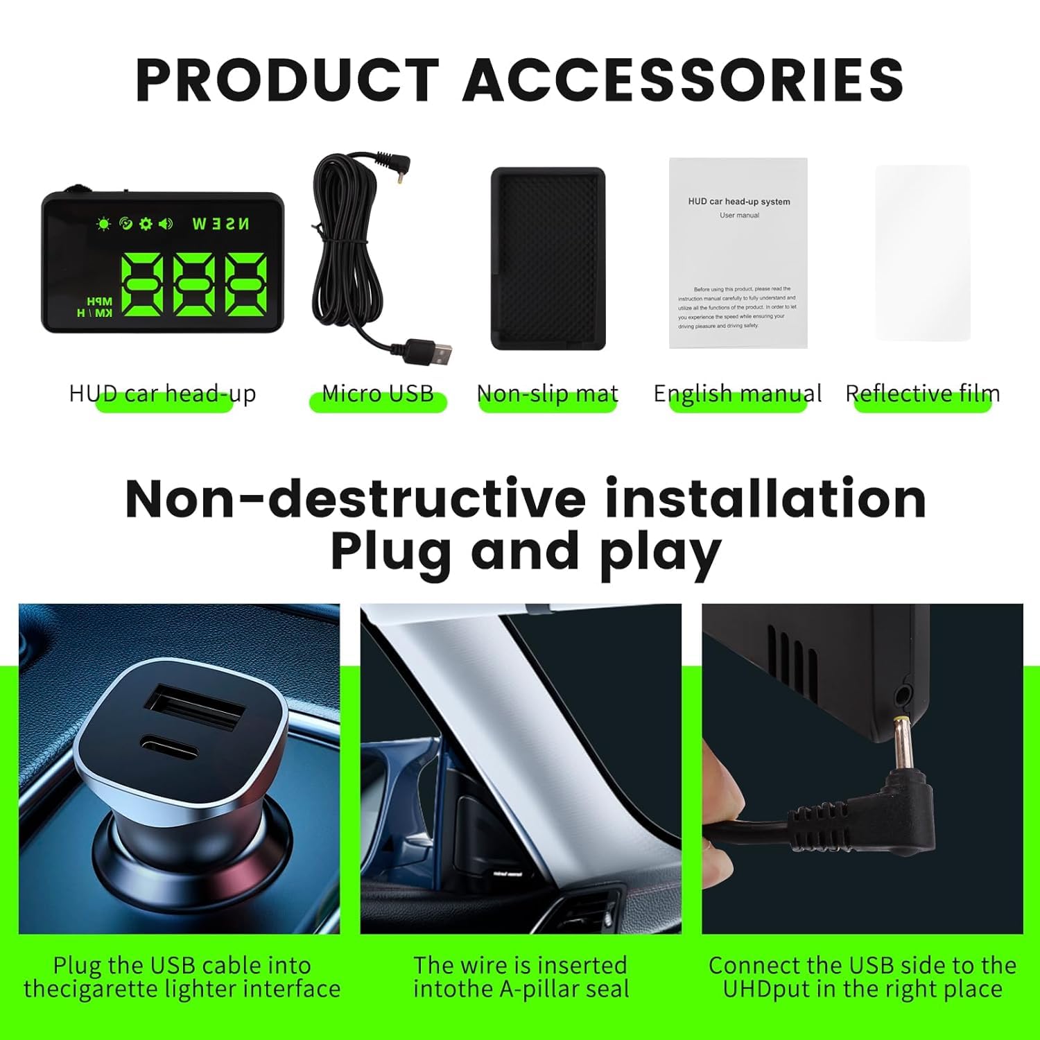 - Clearer Display: Our HUD displays speed in MPH by default, with a maximum display speed of 115 mph, and utilizes a large font design and metal shading technology that effectively eliminates unwanted reflections and ensures a clearer display so that even older drivers with weak eyesight or those wearing sunglasses can see the speed very clearly.