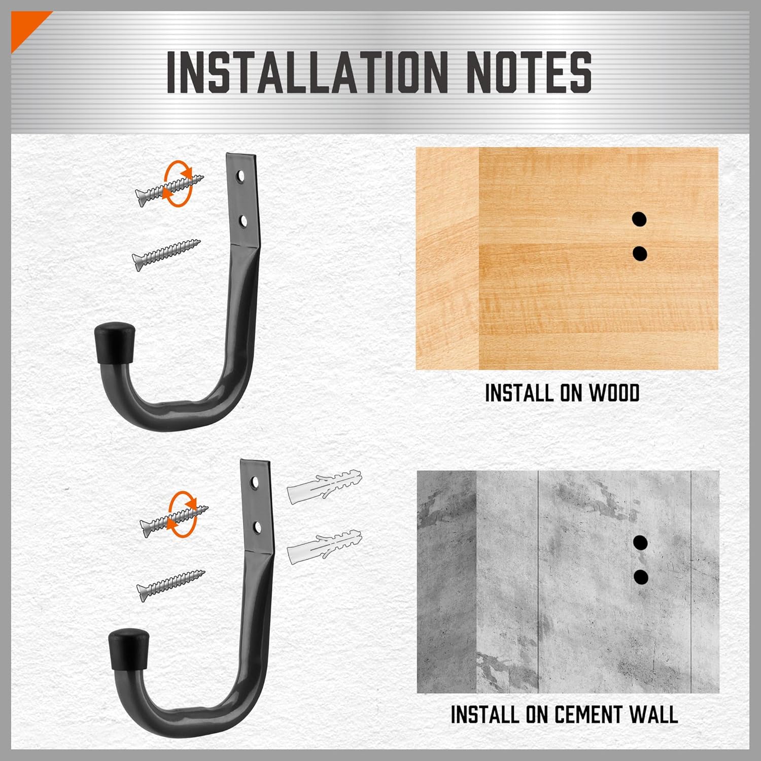 - garage utility hook can install easily on stud walls,hardwood, block or brick with screws.
