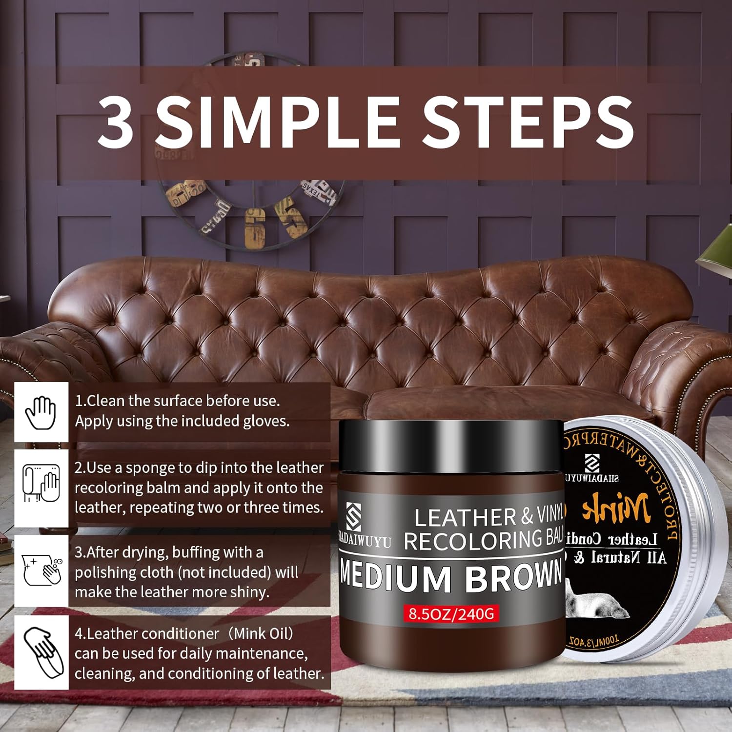 - 【Leather Repair Kit for Furniture】Our Leather Conditioner with Mink Oil is formulated for quick and easy application, providing comprehensive care for your leather furniture. This Leather Recoloring Balm and Repair Kit is designed to restore leather surfaces to their former glory, enhancing longevity and maintaining a vibrant appearance.