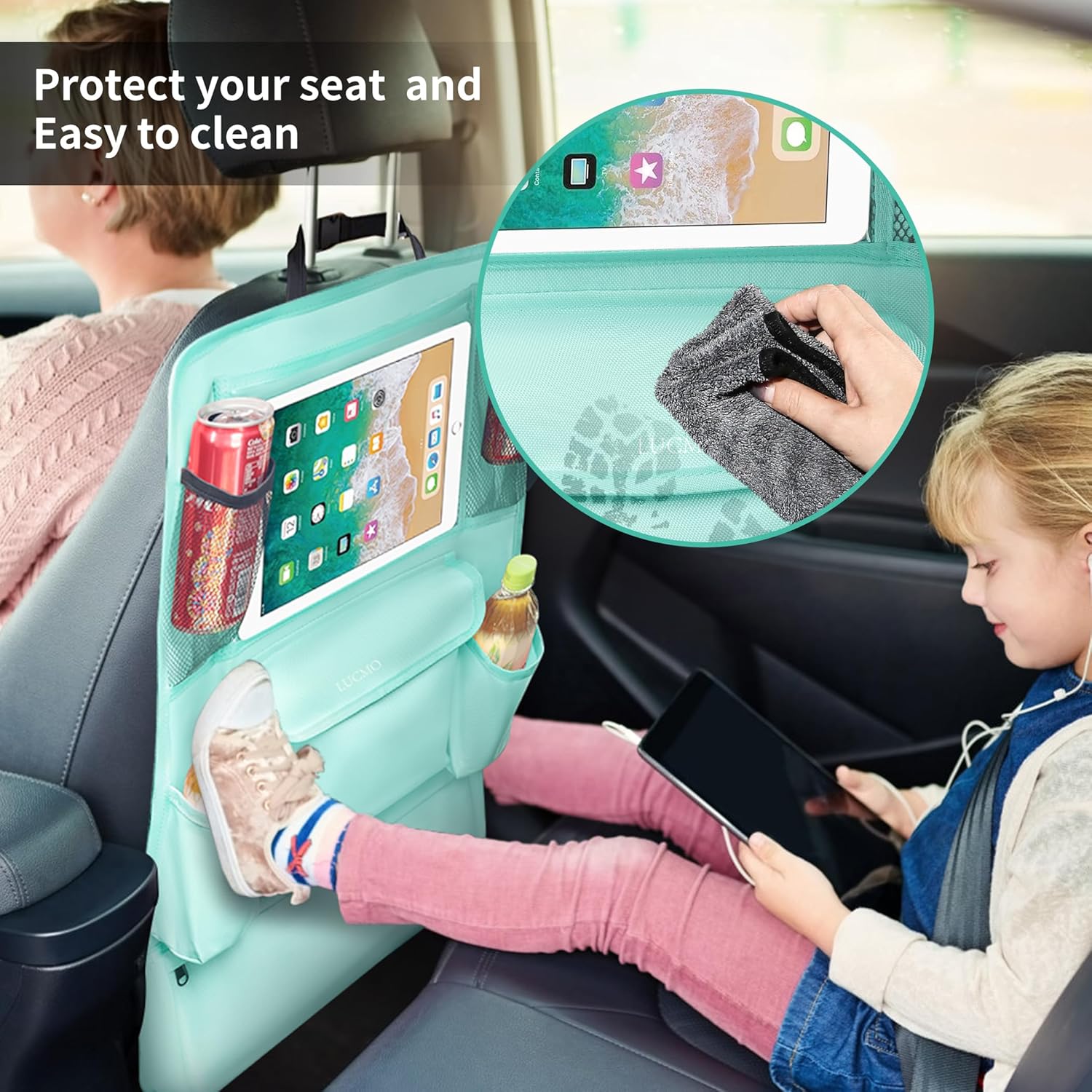 LUCMO Car Backseat Organizer with Touch Screen Tablet Holder,9 Storage Pockets Car Storage Organizer,Protectors Kick Mats Travel Accessories for Kids-Light Blue