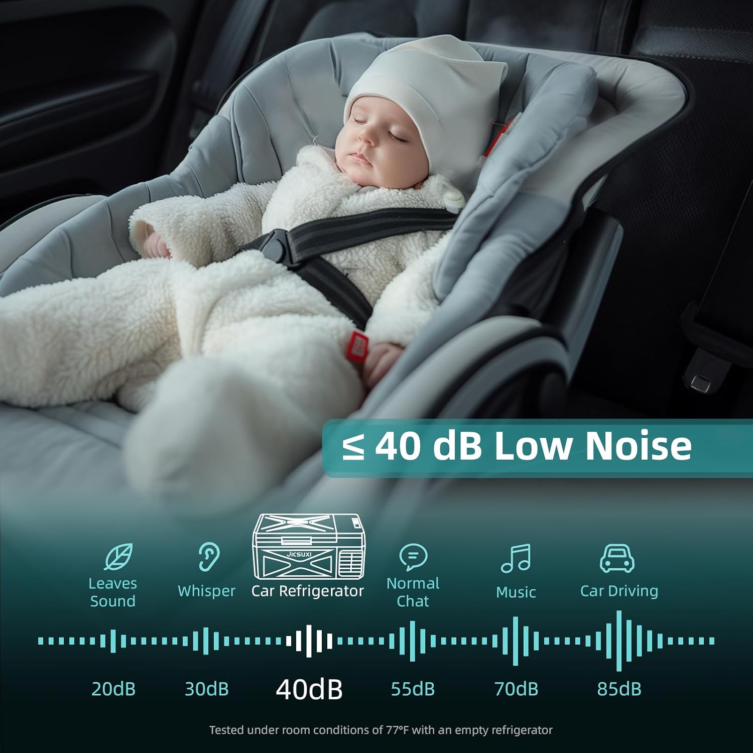 - Portable Design and Anti-Shaking: This compact portable 12v JicSuXi car refrigerator fits easily in your trunk, behind a car seat, or in the bed of a truck, and the reliable handle makes it easy to carryhelp you reduce the burden for travel and camping.This car refrigerator is equipped with advanced anti-vibration technology for uneven outdoor cross-country roads, the car refrigerator will still operate stably even when the road is tilted to an extreme angle of 30°! Allowing you to enjoy the fun of your adventure.