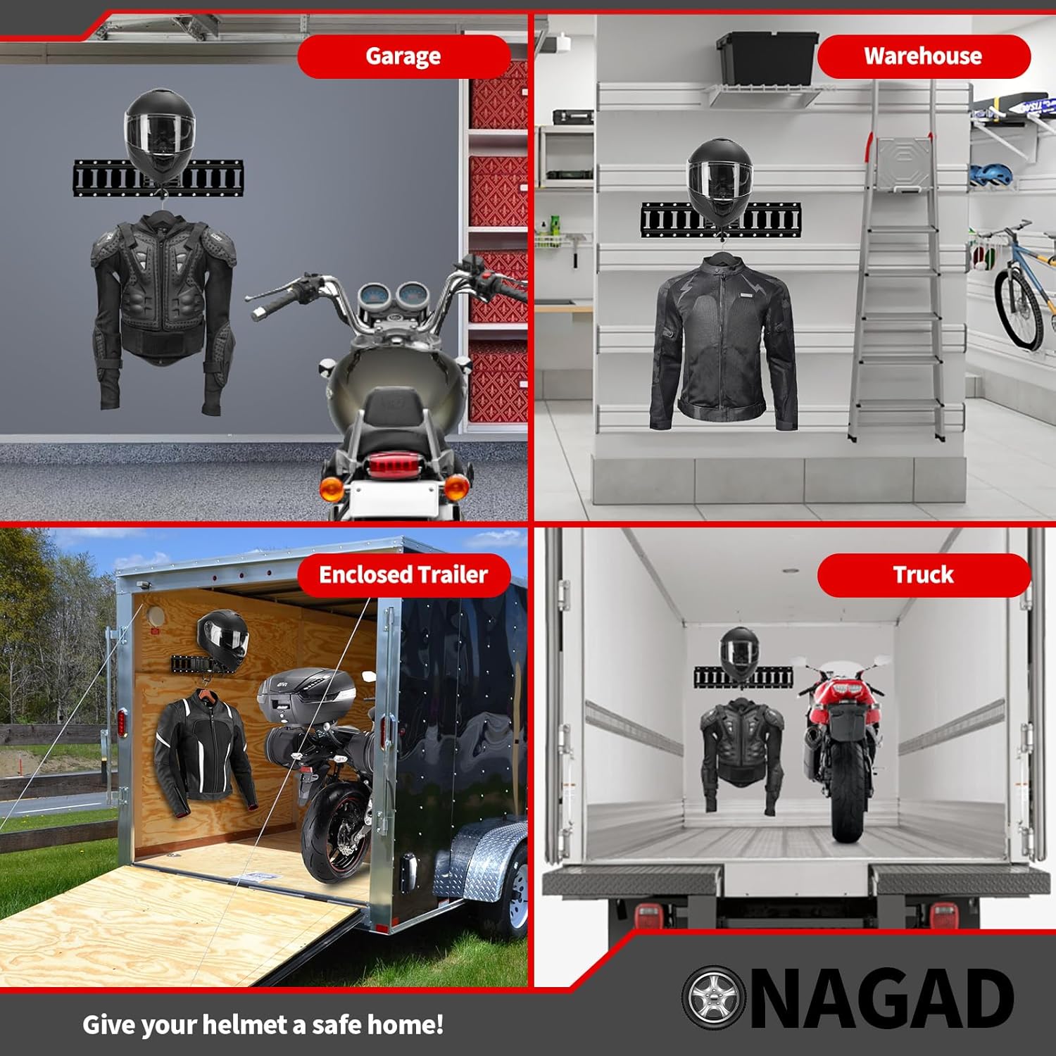 - Protect Your Helmets: We can show you a very simple solution! With E Track Motorcycle Helmet Mount, you can store motorcycle full face helmet, open face helmet, bicycle helmet, safety helmet, baseball helmet and football helmet. Not only can the e track motorcycle helmet rack protect your dirt bike helmet from being scratched or destroyed, but the gloves holder and hook at the bottom can also hang your gloves, jacket, coat and sportswear.