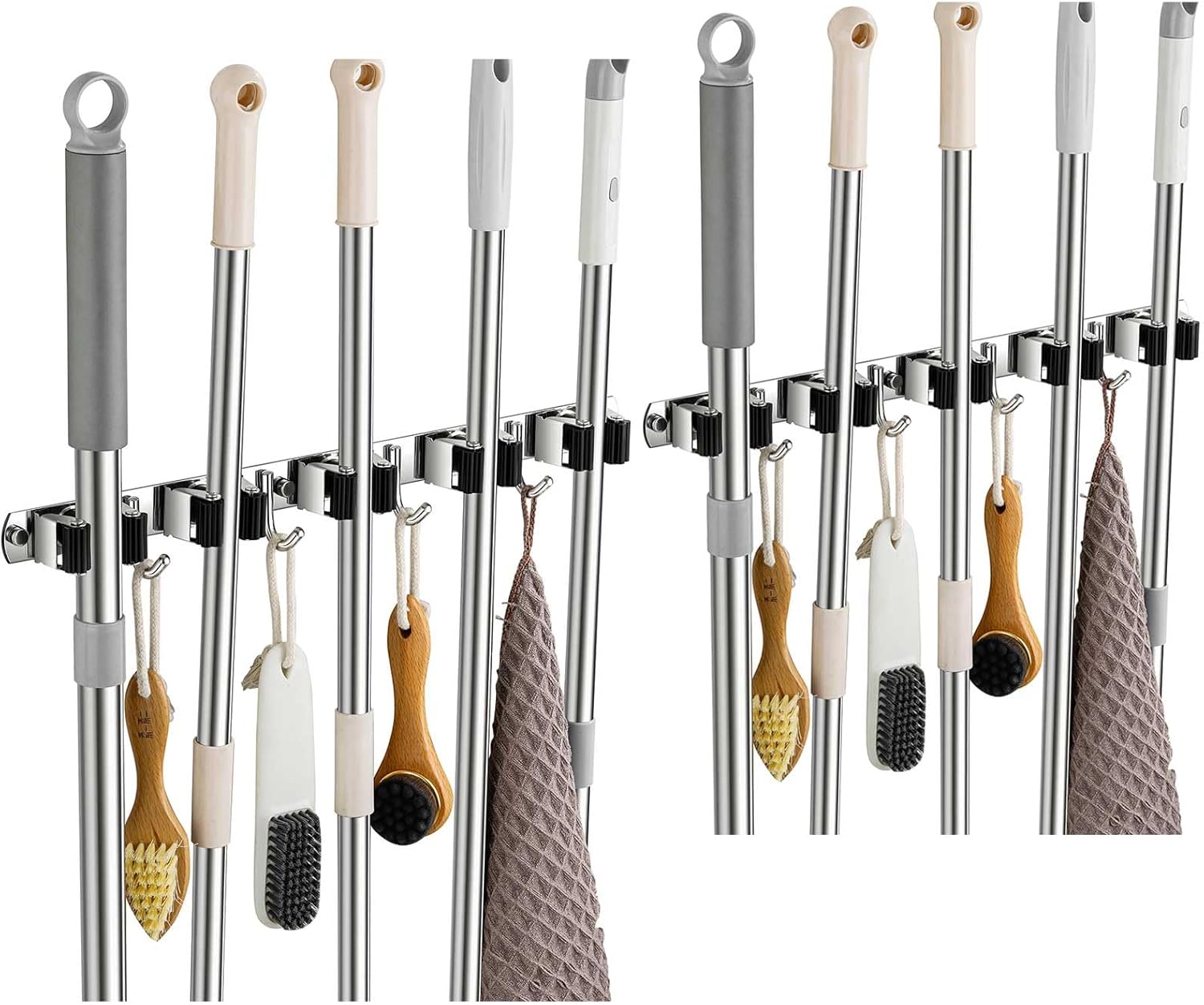 - STURDY & NON-SLIP DESIGN: Our broom and mop holder wall mount is constructed from rustproof stainless steel, offering greater durability than plastic options. It can support up to 44 lbs with screws (or 22 lbs with self-adhesive). The integrated anti-slip silicone prevents scratches and ensures a strong grip, thanks to the double rubber-gripped slots.