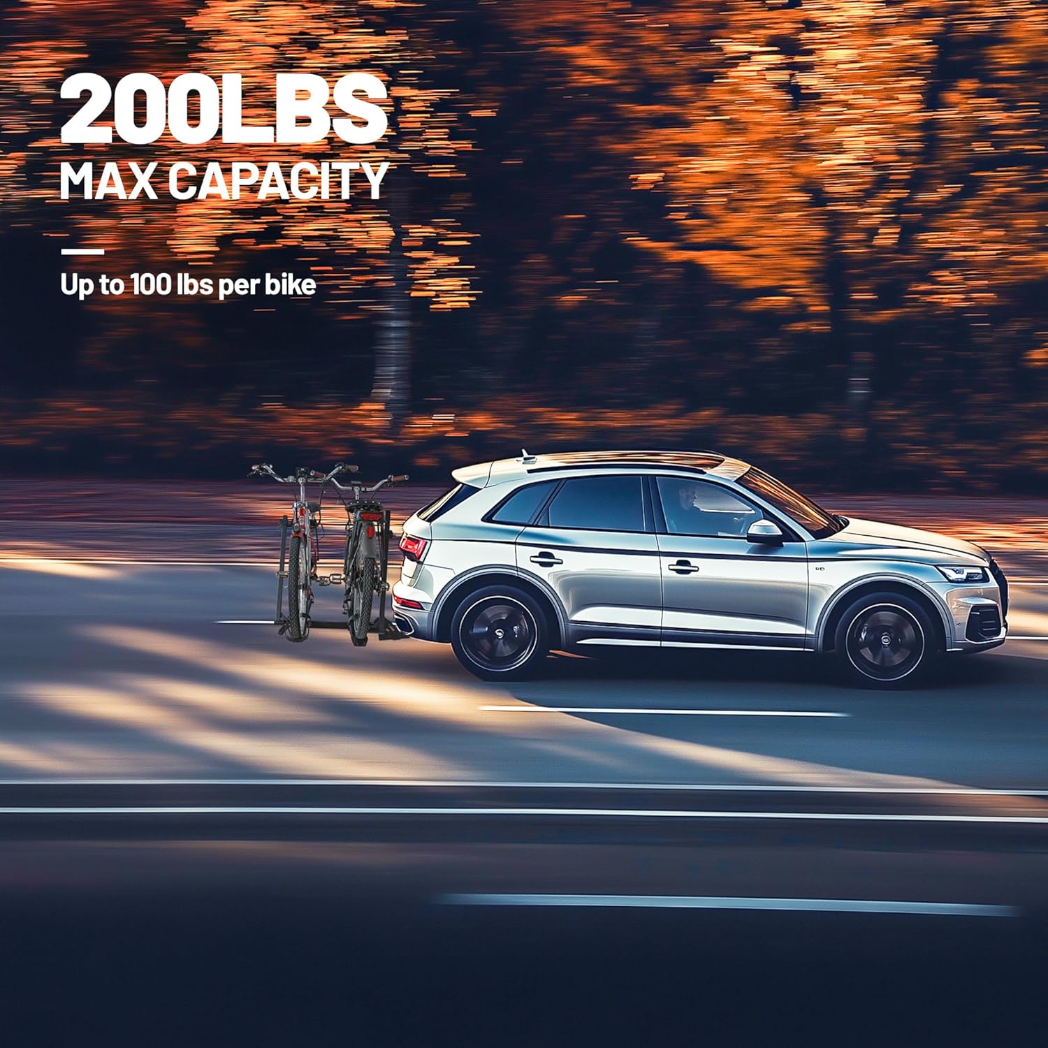 - 200 LB TOTAL CAPACITY: Easily transports up to 100 pounds per bike. Universal tire holders and wheel straps are compatible with e-bikes, mountain bikes, road bikes with up to 5” fat tires.
