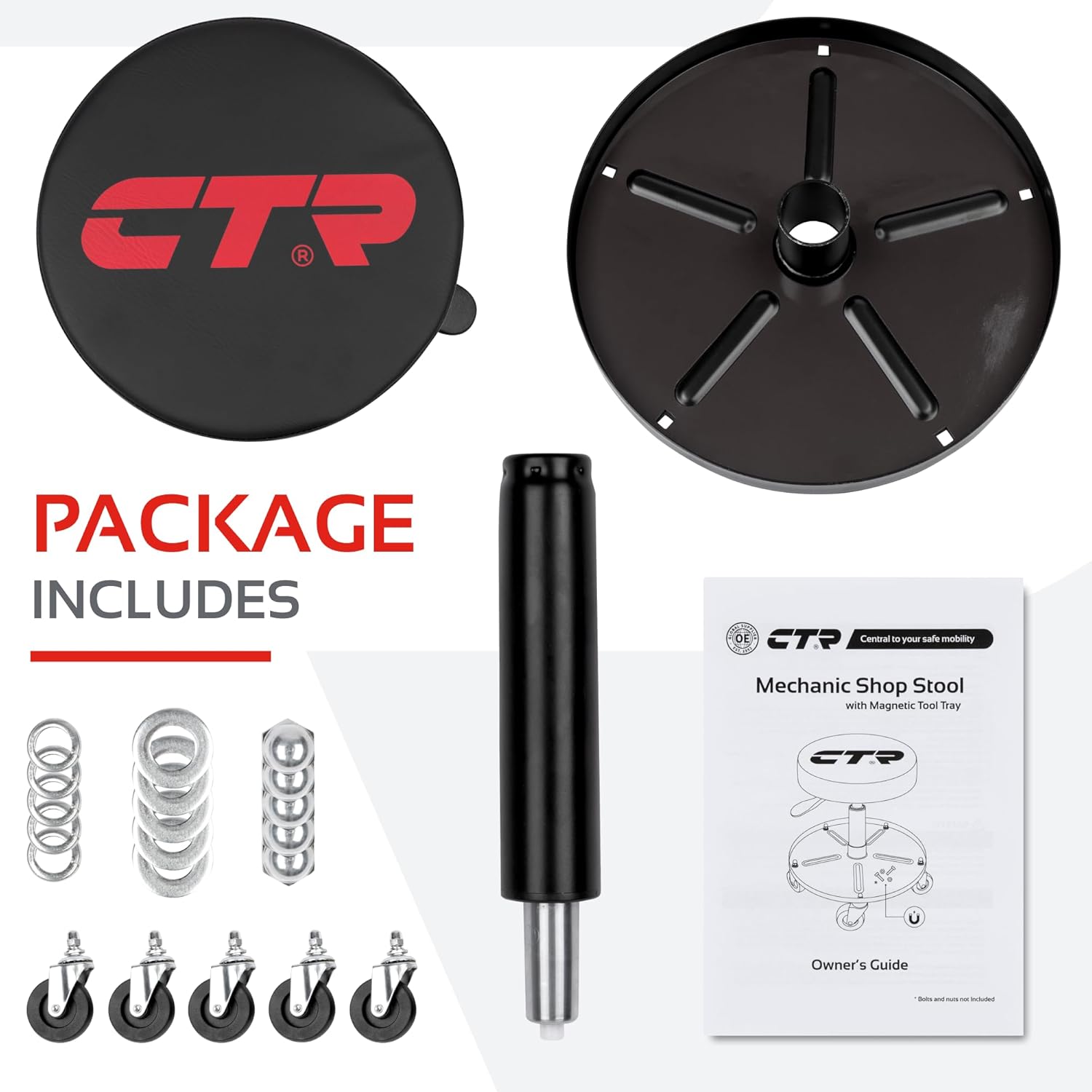 CTR Rolling Mechanic Shop Stool with Magnetic Tool Tray, Heavy Duty Work Stool, Adjustable Garage & Workbench Stool with Wheels, Creeper Seat Shop Chair