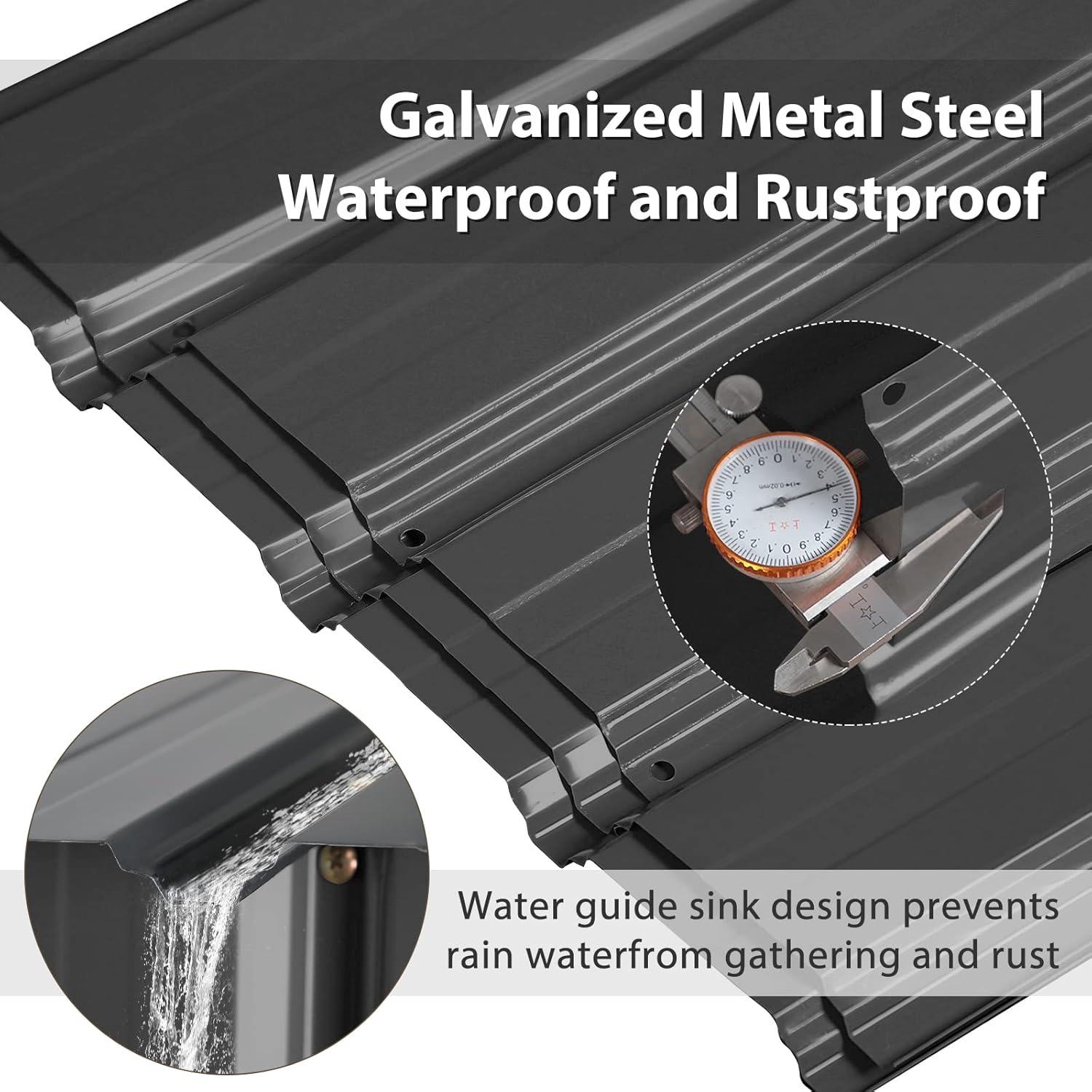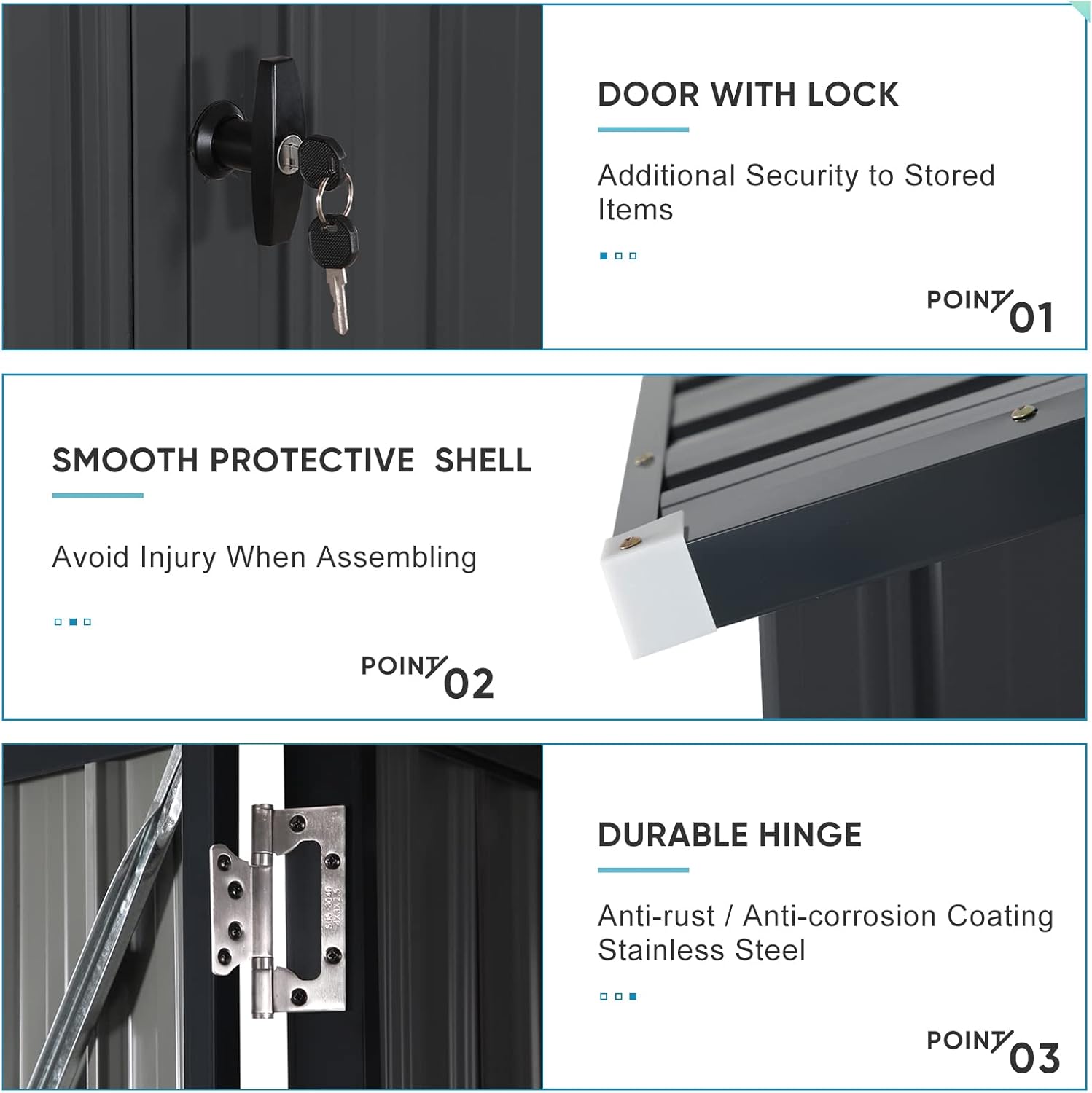 - đĄăHigh-Quality Material ă-Our outdoor tool shed is constructed with thicker galvanized steel panels, making it weather-resistant, waterproof, and UV-protected. The lock for additional security to your stored items / Smooth plastic protective shell for screw and roof panel corner to avoid injury / Each piece panel is tightly connected and will not leak rain / Durable hinge and steel-reinforced door. This outdoor storage house is the best shed for storage, better and safer.
