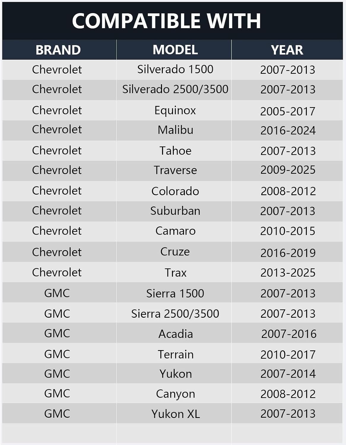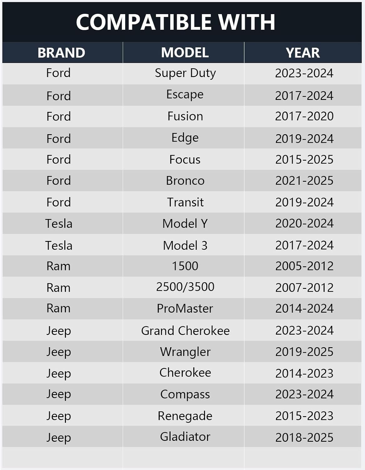 - Suitable: Compatible with Ford Super Duty 2023-, Escape 2017-, Fusion 2017-, Taurus , Edge 2019-, Focus 2015-, Bronco, Transit 2019-, Tesla Model Y, Model 3, Ram 1500/2500/3500 2007-2012, ProMaster, Chevrolet Silverado 1500/2500/3500 2007-2013, Equinox 2005-2017, Malibu 2016-, Tahoe 2007-2013, Traverse, Colorado 2008-2012, Suburban 2007-2013, Camaro 2010-2015, Cruze 2016-2019, Trax, GMC Sierra 1500/2500/3500 2007-2012, Acadia 2007-2016, Terrain 2010-2017, Yukon 2007-2014, Canyon 2008-2012, Yukon XL 2007-2013, Jeep Grand Cherokee 2023-2024, Wrangler 2019-2025, Cherokee, Renegade, Gladiator