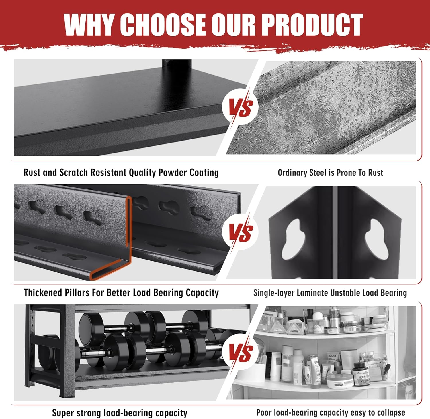 - ăSuperb Weight CapacityăEngineered with industrial-grade cold-rolled steel for superior strength and weldability, this heavy duty garage shelves outperforms wooden racks prone to warping or moisture damage. Reinforced crossbars and stabilizing braces ensure unwavering stability, even under heavy loadsâno wobbling or bending over time
