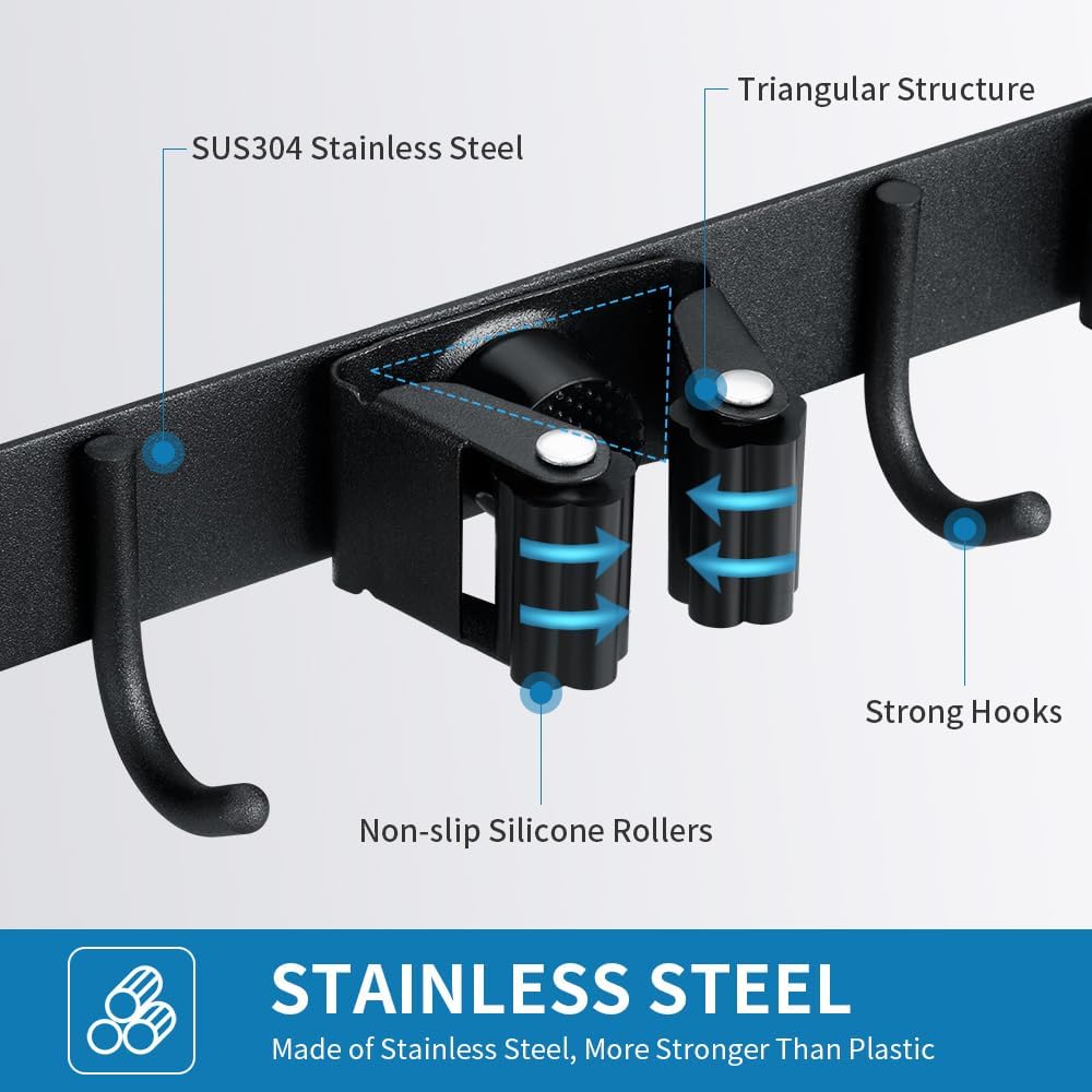 - đ ăSTRONGEST HOLDERă-Broom organizer wall mount is made of premium stainless steel, can be used in any humid environment, indoor or outdoor, no risk of rusting, lasting for long life time; Compared with the plastic broom rack, our broom organizer is more stronger and durable and has a longer service life.