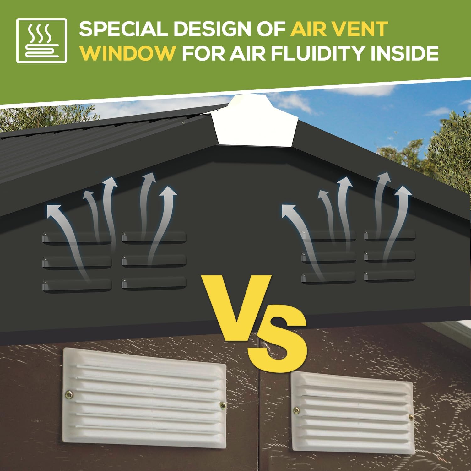 - Reliable Construction: We've put extensive research into this shed’s design, resulting in a sloped roof that prevents water accumulation during heavy rains. Special air vents maintain proper ventilation, and plastic caps ensure safety. The interior structure is sturdy and reinforced for long-lasting durability.