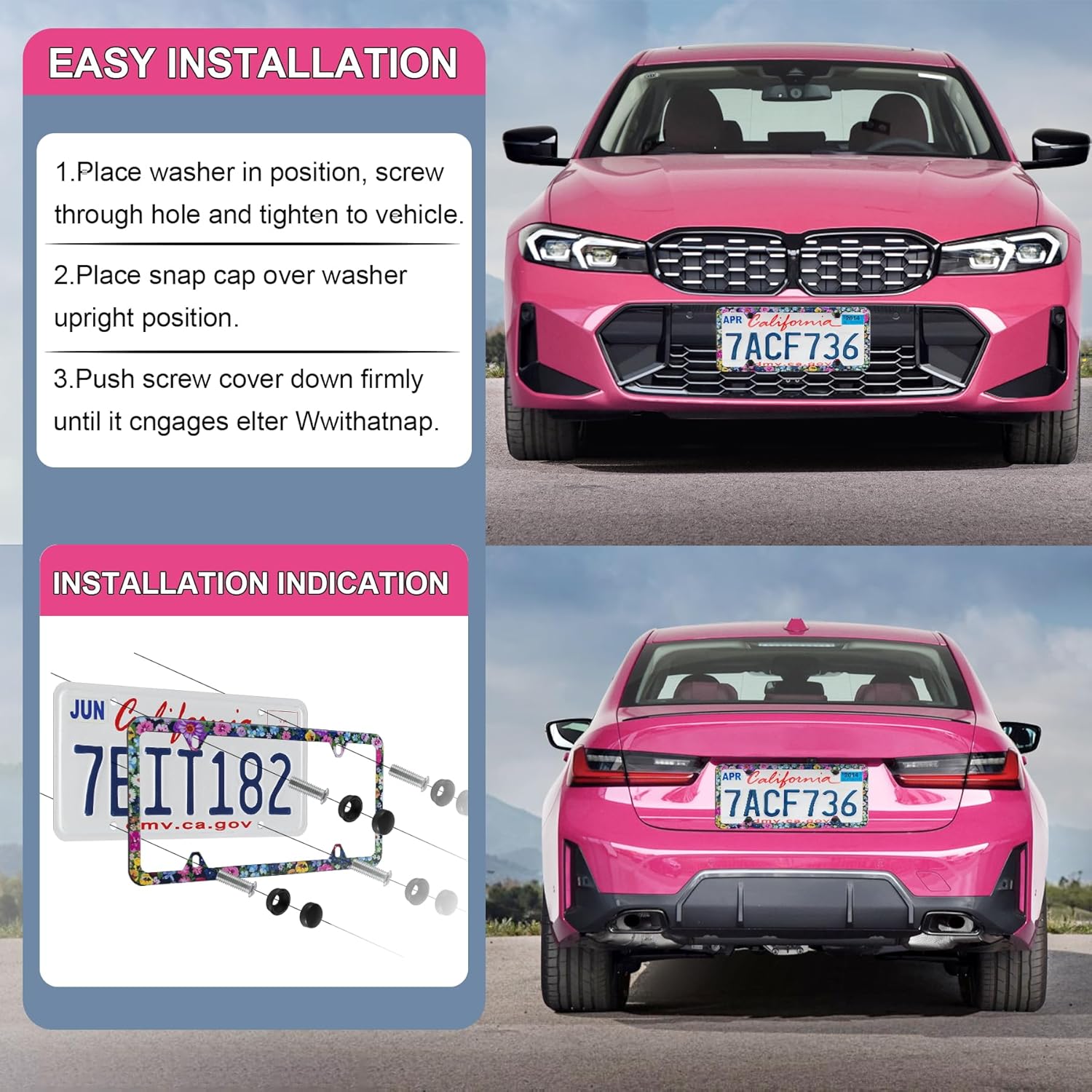 LivTee Flower Floral License Plate Frames, 4 Holes Stainless Steel License Plate Covers, 2PCS Car License Plate Holder, Automotive Exterior Accessories