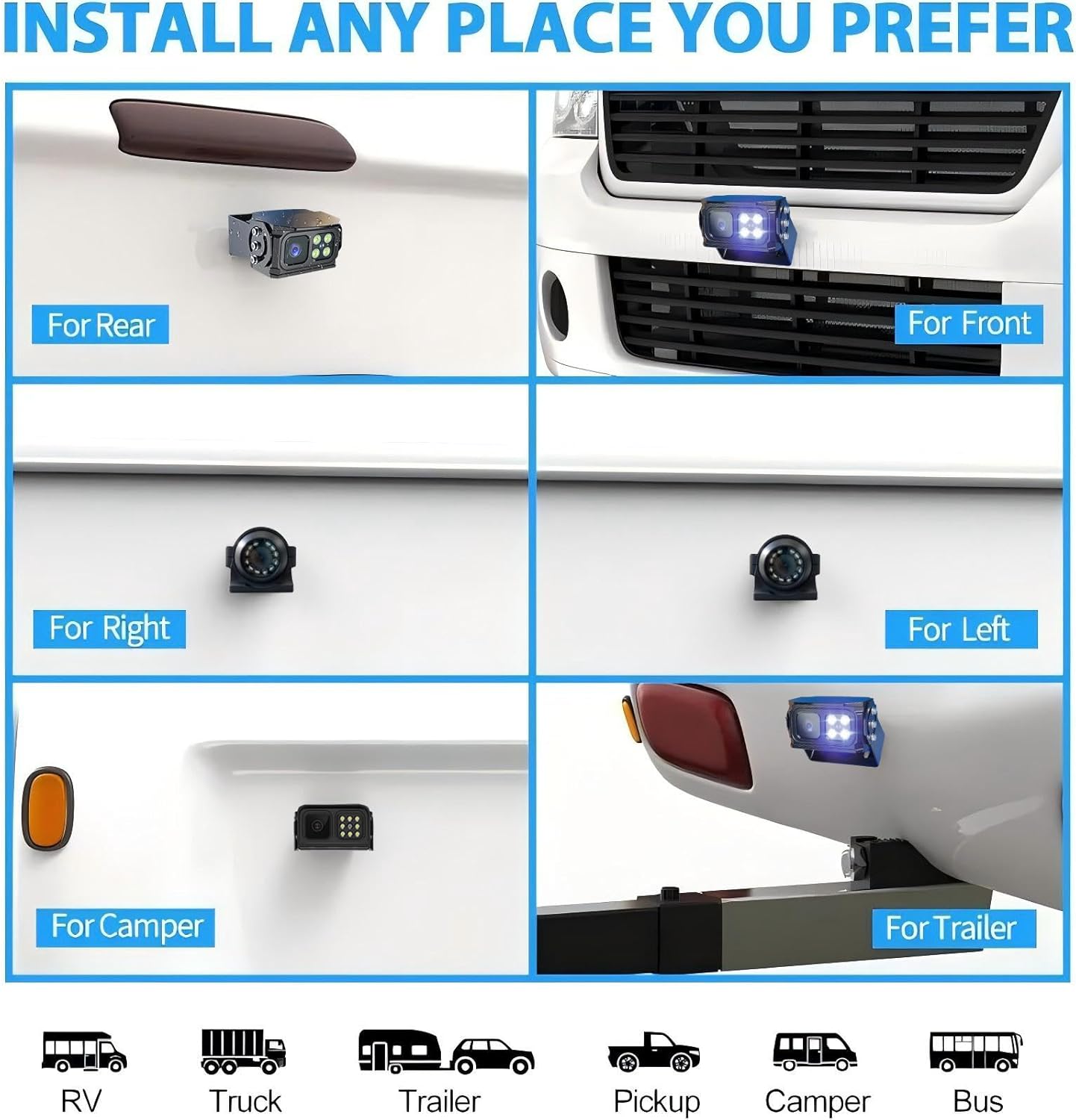 - 4pcs AHD 1080P Cameras, Clearer and advanced bright color separation, signal filtering, 3D noise reduction technology, higher image clarity and better image reproduction. you can install four HD cameras in front, left, right and rear side of the vehicle, and separately connect them to the monitor. you will enjoy real-time driving monitor, driving assistance, parking monitor anytime & anywhere.