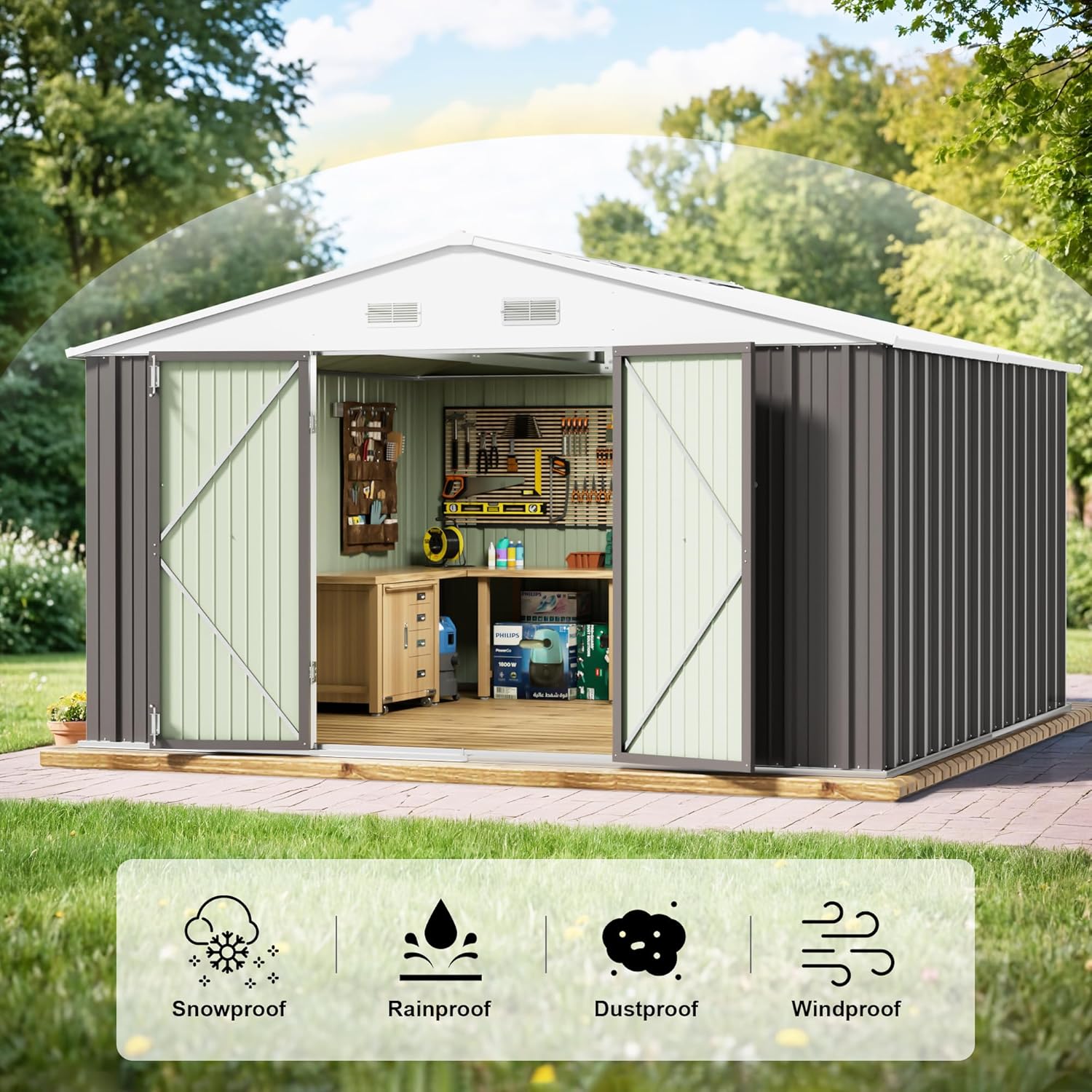 - [ Durability and Safety ]: The metal shed's pitched roof prevents rainwater from accumulating and is equipped with a door lock for security. In addition, the equipped vents promote air circulation.