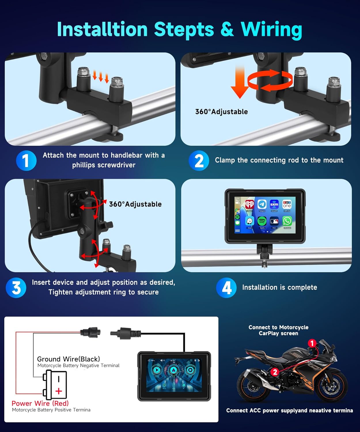 - Smart Connection: This motorcycle car play supports wireless CarPlay and Android Auto, easily synchronize your smartphone for GPS navigation, audio playback, calls and voice control, allowing you to focus more on driving. Dual Bluetooth connectivity provides more flexibility, the 5-inch motorcycle Apple CarPlay screen connects to your phone, while the phone can connect to a Bluetooth headset or helmet for wireless calls and music playback