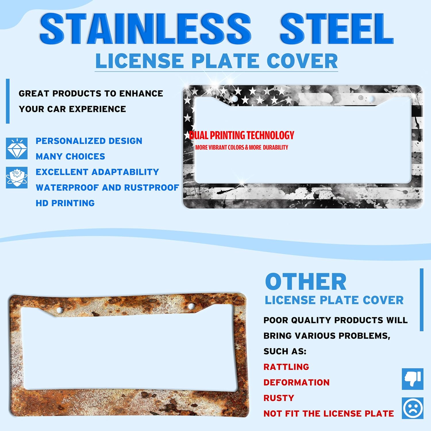 - STAINLESS STEEL LICENSE PLATE: The material is strong and not easy to bend, and can be used for a long time.The multi-layer protective design treatment improves your experience of using the license plate frame.