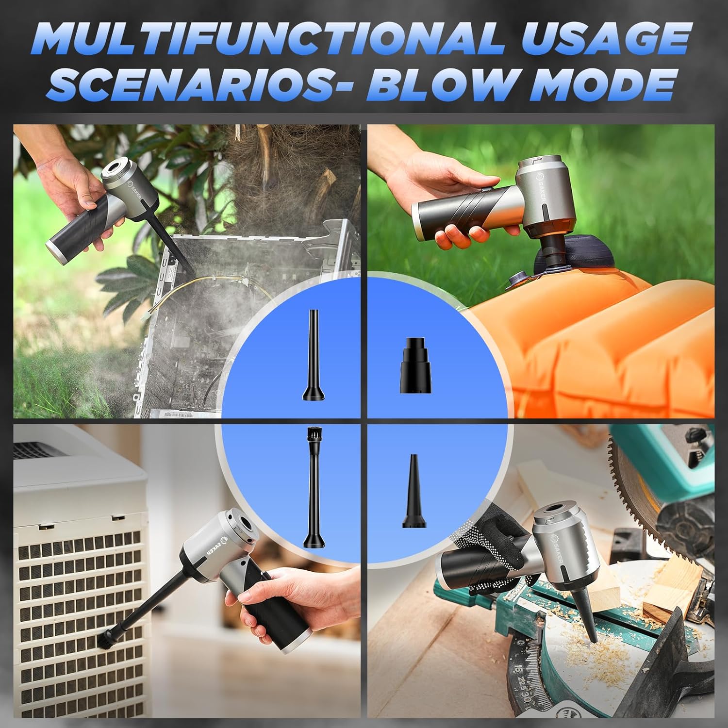 - ă3-in-1 Multifunctional Mini Car Vacuum CleanerăSaker portable car vacuum is equipped with a variety of accessories to meet various usage scenarios such as blowing, sucking and pumping. It can not only clean computer keyboards, host computers, windows and other difficult-to-clean gaps, but also sofas, seats, cars, woodworking workshops, offices, etc, to meet your various cleaning needs.