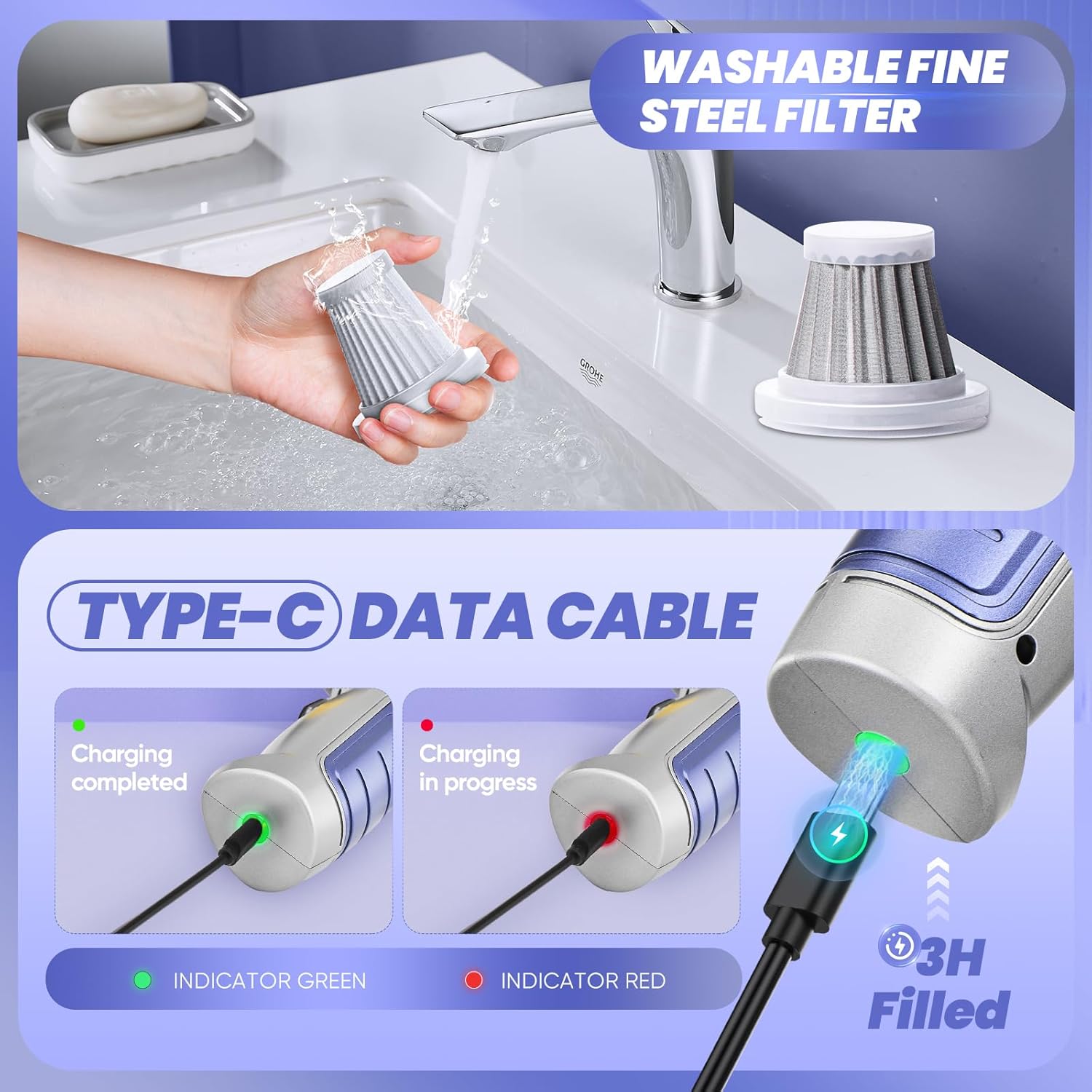 - ăHEPA Filteră The handheld vacuum cleaner is equipped with two different filters. The HEPA filter can be washed and can be used for 2-3 months. The upgraded fine steel filter can be used again with a simple wash, and the service life can be more than 1 year.