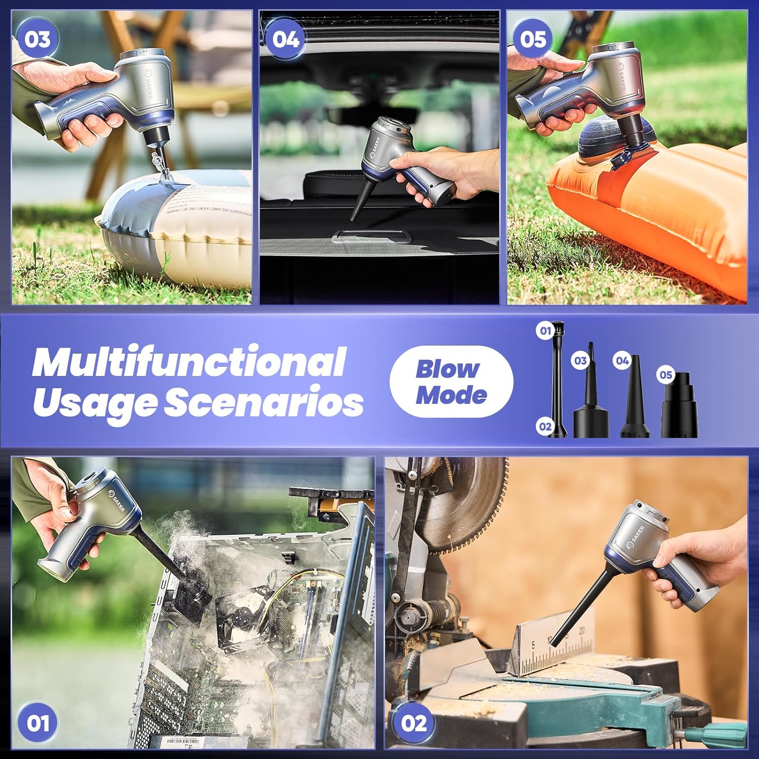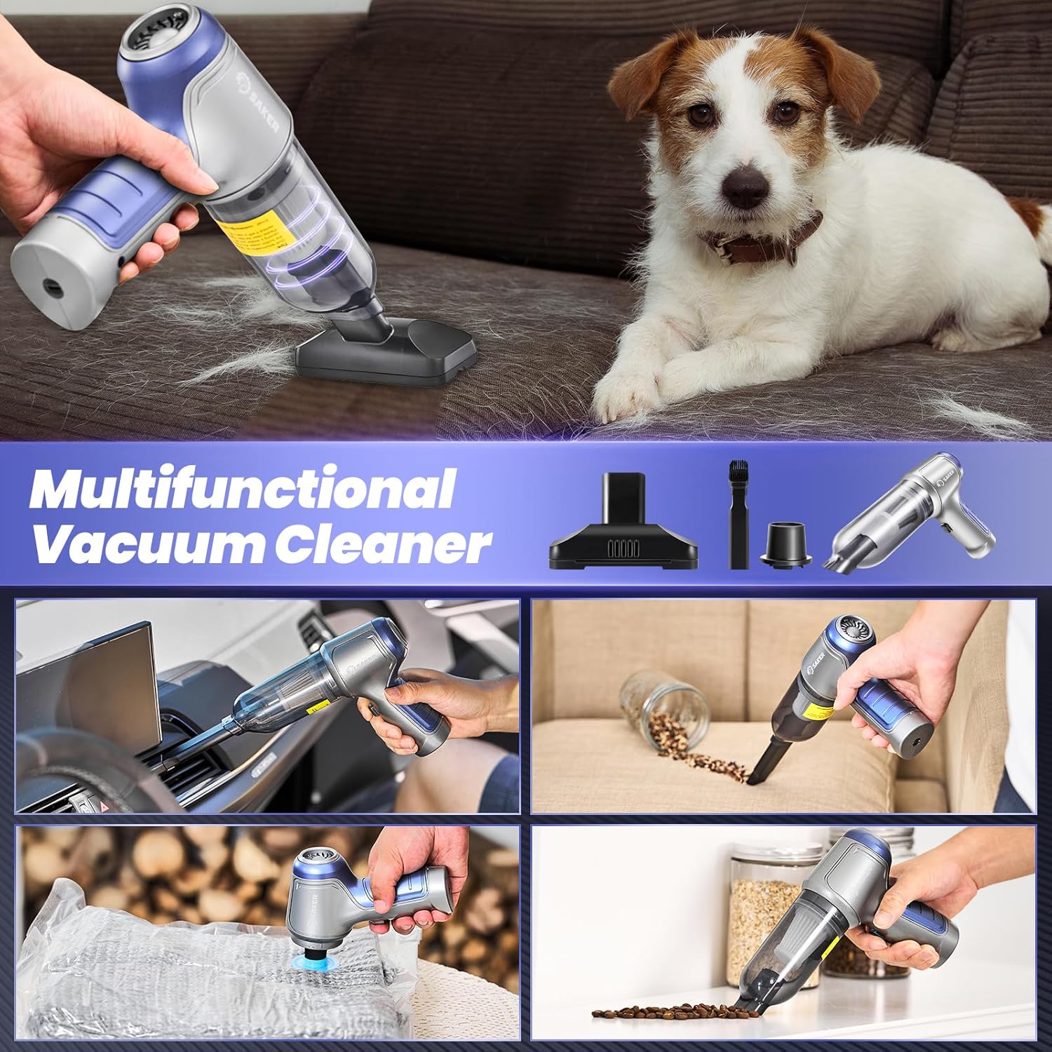 - ă3-in-1 Multifunctional Mini Vacuum CleanerăThe mini vacuum cleaner is equipped with a variety of accessories to meet various usage scenarios of blowing, sucking and pumping. It can not only clean computer keyboards, host computers, windows and other difficult-to-clean gaps, but also clean large-area stains in sofas, seats, cars and other areas to meet your various cleaning needs.