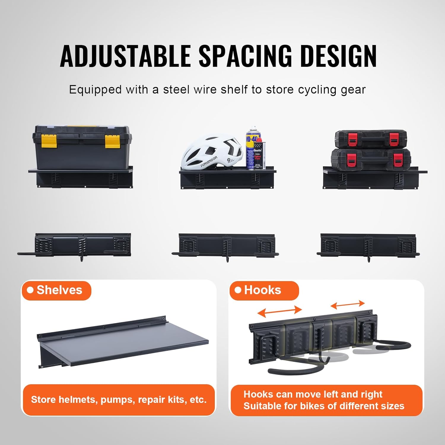 VEVOR Bike Storage Rack, 6 Bike Racks and 3 Helmets Hooks, Wall Mount Bike Storage Hanger with 3 Shelves, Home & Garage Organizer, Customizable for Various Bike Sizes, Holds Up to 300 lbs, 48-inch