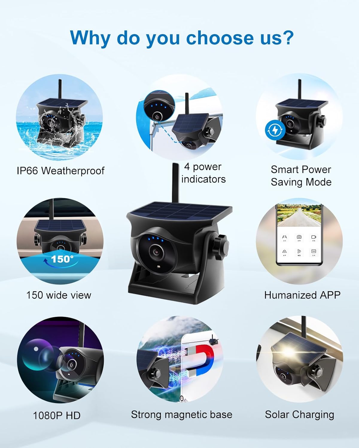 - ăContinuous Solar Poweră Equipped with an efficient solar panel, the wireless magnetic backup camera requires just 2 hours of sunlight daily to maintain year-round operation. The 3000mAh rechargeable battery and multiple charging options (USB, plug-in, car charger) ensure uninterrupted performance, making it ideal for long-distance truck drivers or those frequently traveling in busy cities