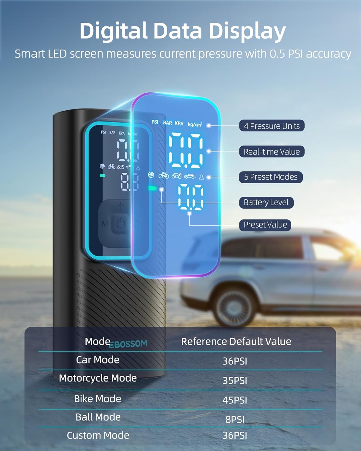 - MULTI-COMPATIBLE: The air pump has 5 preset inflation modes + 4 pressure units. Not only for car and bicycle tiresโit's a versatile tool that can handle motorcycle, basketball, and even for balloon or small swim ring inflation needs.