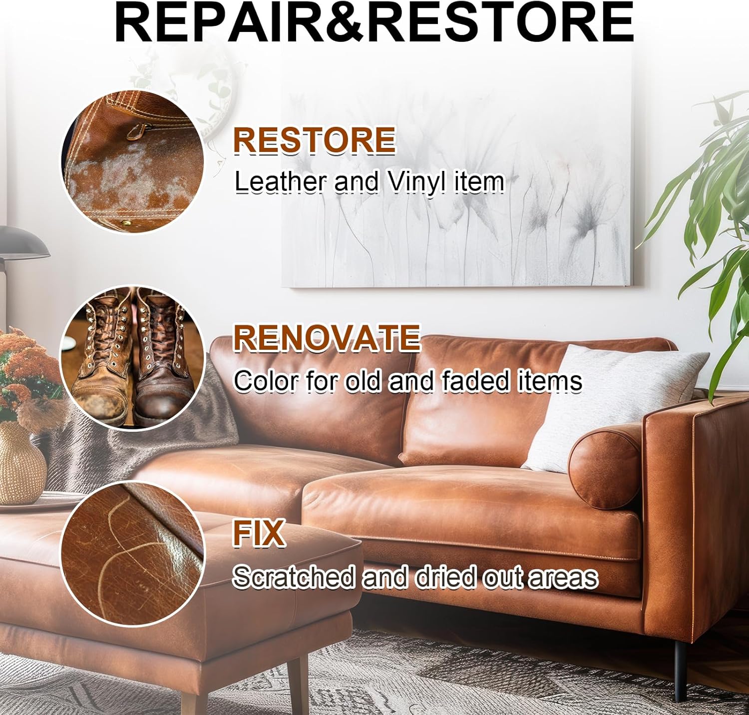 - Leather Color Restorer-Ideal leather furniture dye for restoring stains scratches fading color wearing leather surface, filling the damaged part with repair paste into one that looks like almost new. Polished leather with mink oil will be soft and shine, protect leather a longer using life