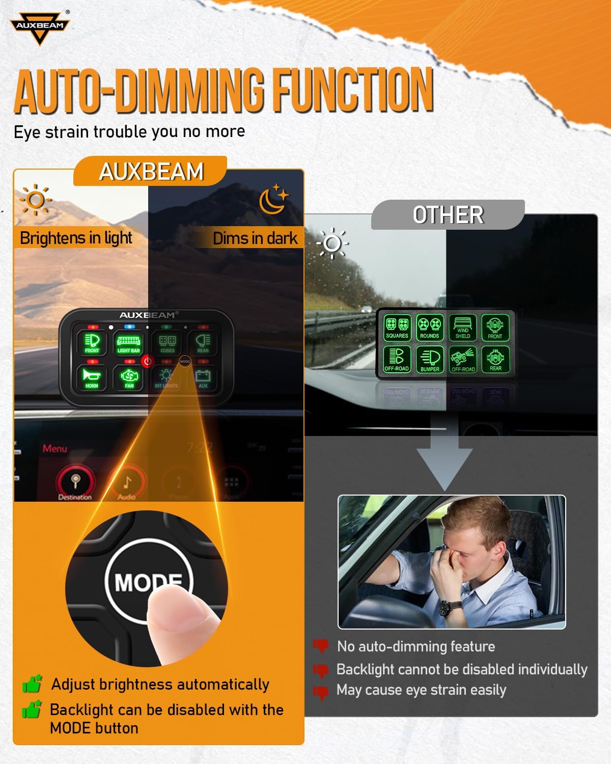 - ăRGB Backlight with Auto-Dimmingă: This Auxbeam 8 gang switch panel offers a wide range of RGB backlight color options to suit your car's ambient lighting. With auto-dimming functionality, the backlight adjusts to be bright in daylight and dim at night, reducing eye strain