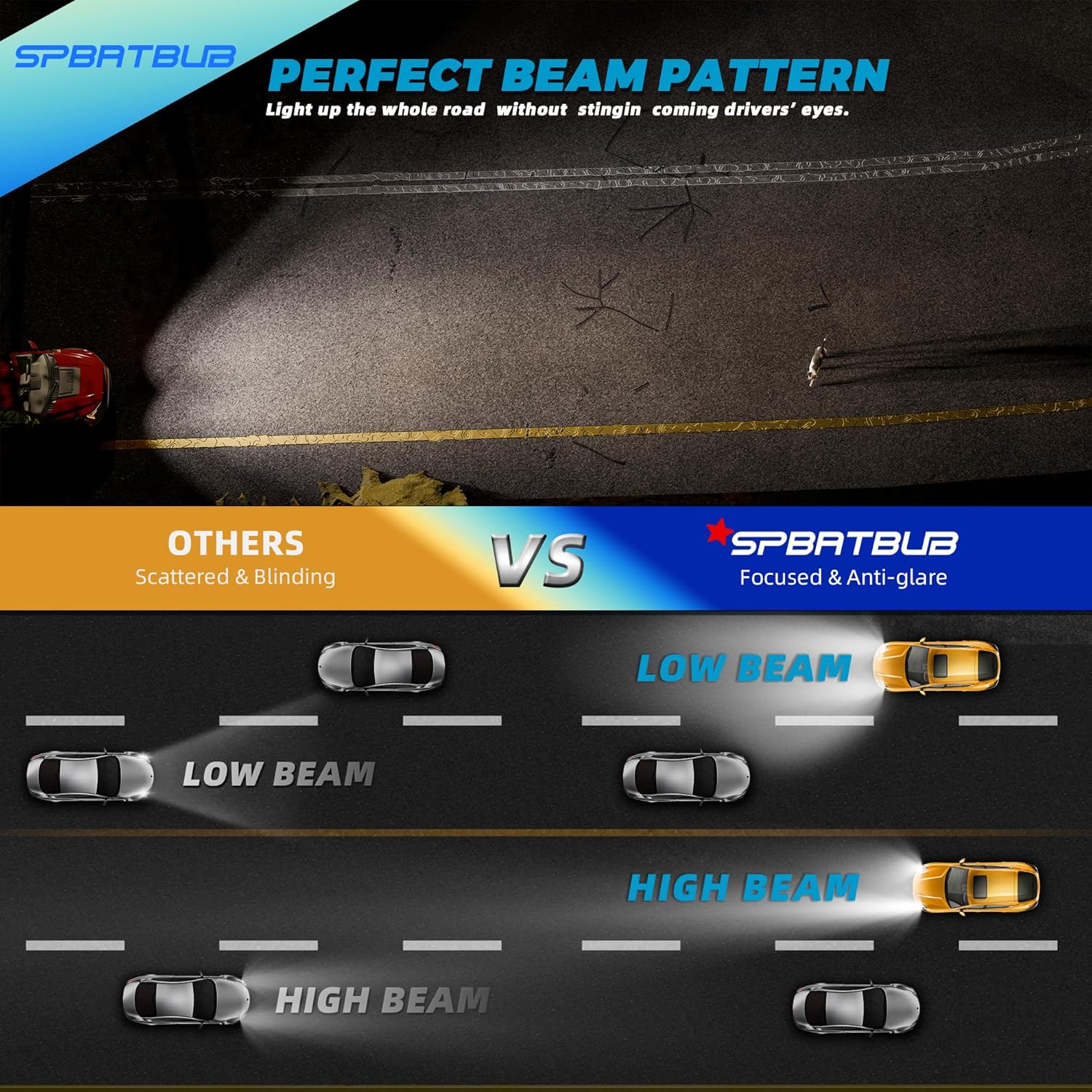 - đă300% Brighter/Power SavingăThe headlight bulbs are 3 times brighter than original bulbs,100w per bulb, 6000k white perfect beam. Halogen light bulbs with new chips, luminous flux up to 1200 lumens/bulb.This Halogen headlight beam has perfect beam patterns and excellent cut-off lines. No black spots. No Flashing or Flickering. Also it gets a 100% power saving compared with original halogen.