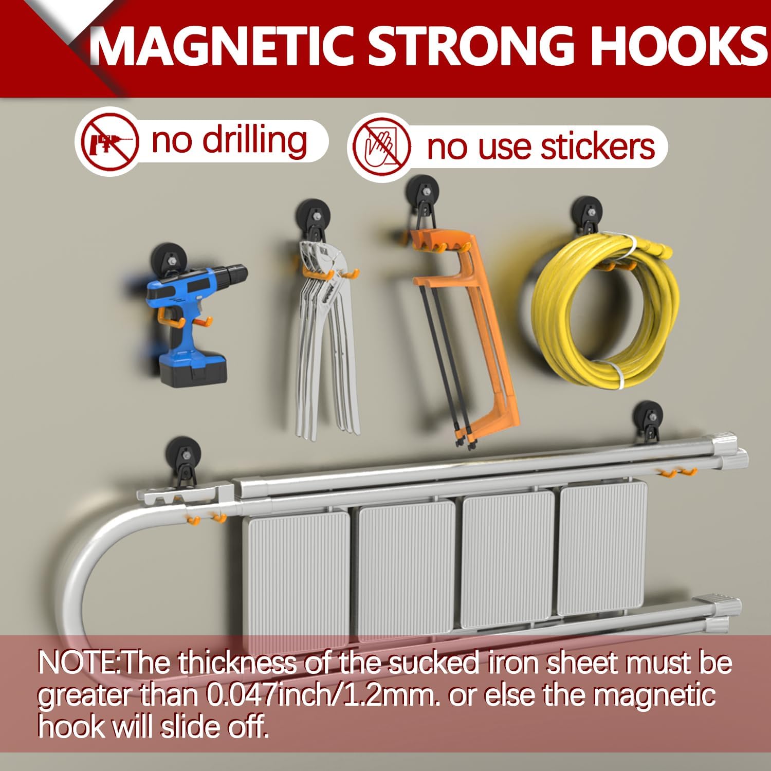 - Space Saving Heavy Duty Magnetic Hook: Our strong magnetic hooks offer an ideal solution for efficiently utilizing vertical garage storage space. The heavy duty magnetic hook is portable,versatile for use in garages, kitchens, offices, warehouses, gardens, and basements. These magnet hooks heavy duty help to reduce clutter and maximize available space to hang hoses, ropes, shovels, wires, cables, rakes and more