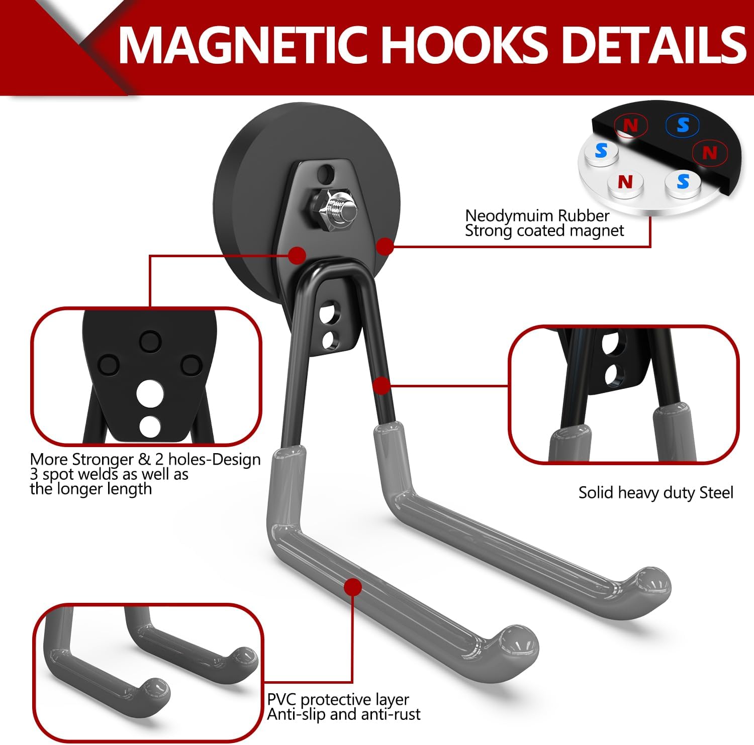 - Innovative No-Drill Magnetic Hooks: Eliminate the need to punch holes and effortlessly adhere magnet hooks to any metal surface, you can move them around as your needs change. The large magnetic hook has a dual-hook design for versatile use and can be separated into magnet and hook components. Our magnets with garage hooks heavy duty are coated with non-slip PVC and has protective sleeves to prevent scratches and rust