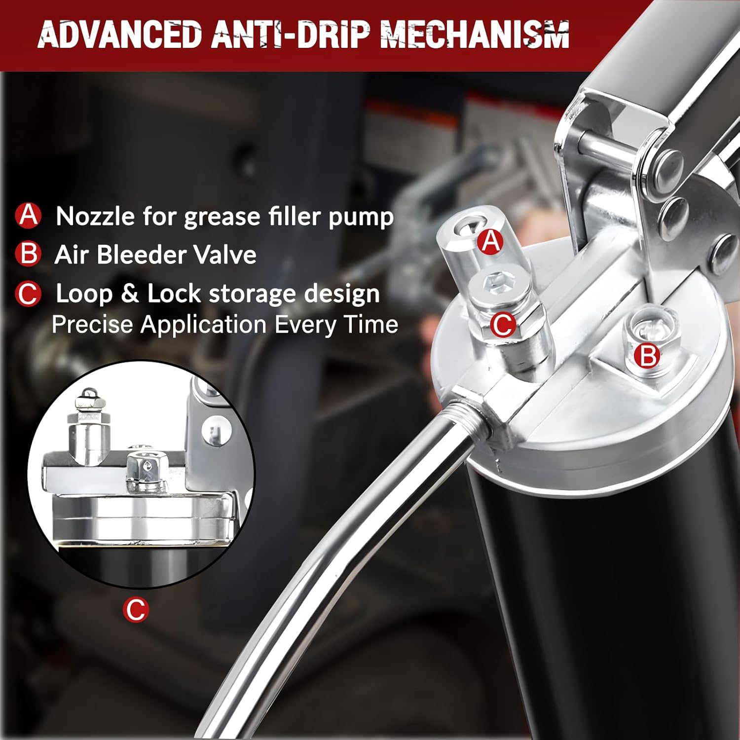 - Precision & Safety: Equipped with an advanced anti-drip mechanism, the GATTLELIC grease gun prevents unwanted grease leakage, ensuring precise application and reducing waste. The easy-release exhaust valve allows for effortless air bladder removal
