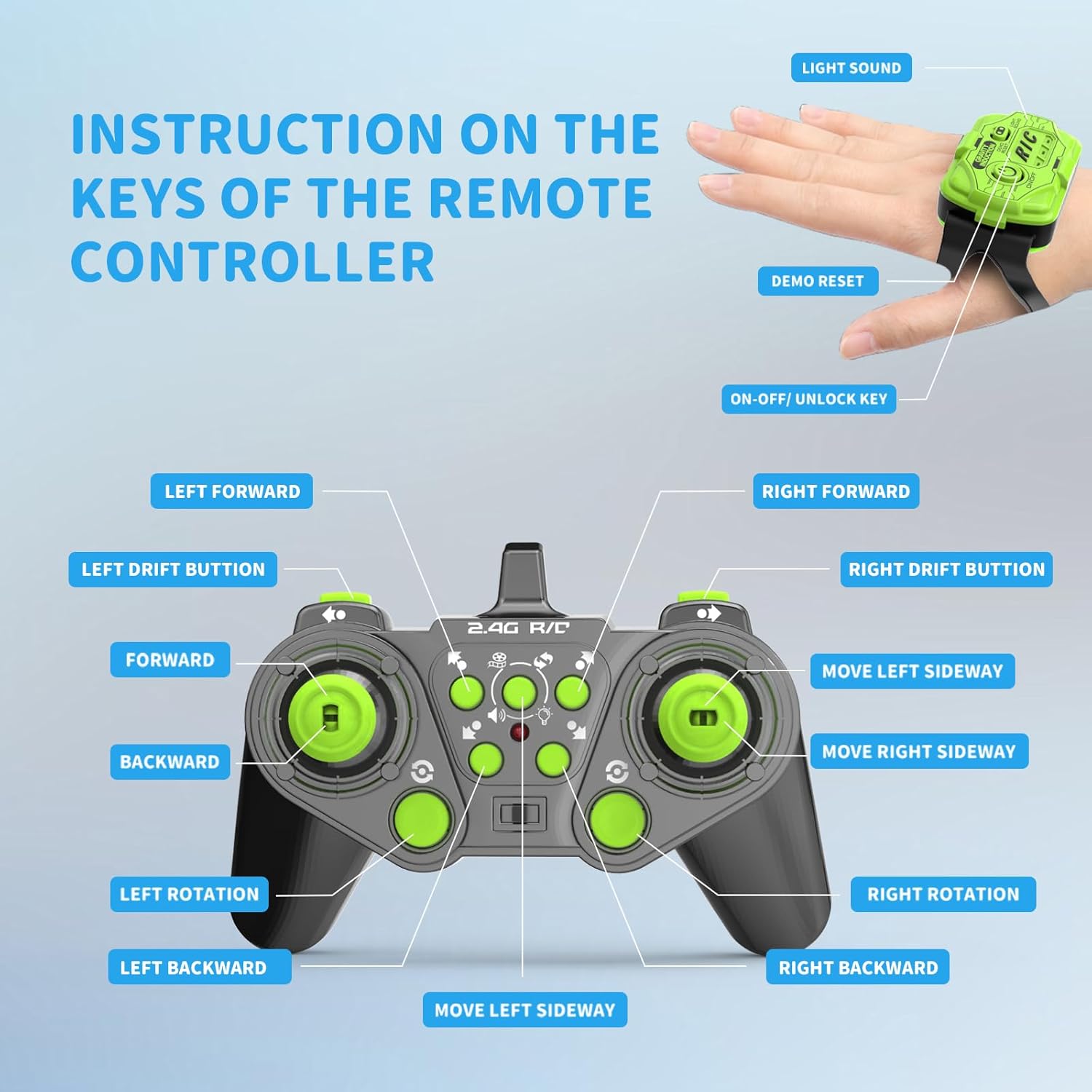 - 2 Senstive Control Modes:1.Gravity Watch RC,2.2.4Ghz RC:Using 2.4GHz transmission technology, the control is sensitive and ultra-long-distance control, which can realize multiple hand-controlled remote control cars to play together, ensuring that children can drive freely for long distances without interference. (Note: The watch remote and normal remote do not contain batteries.)