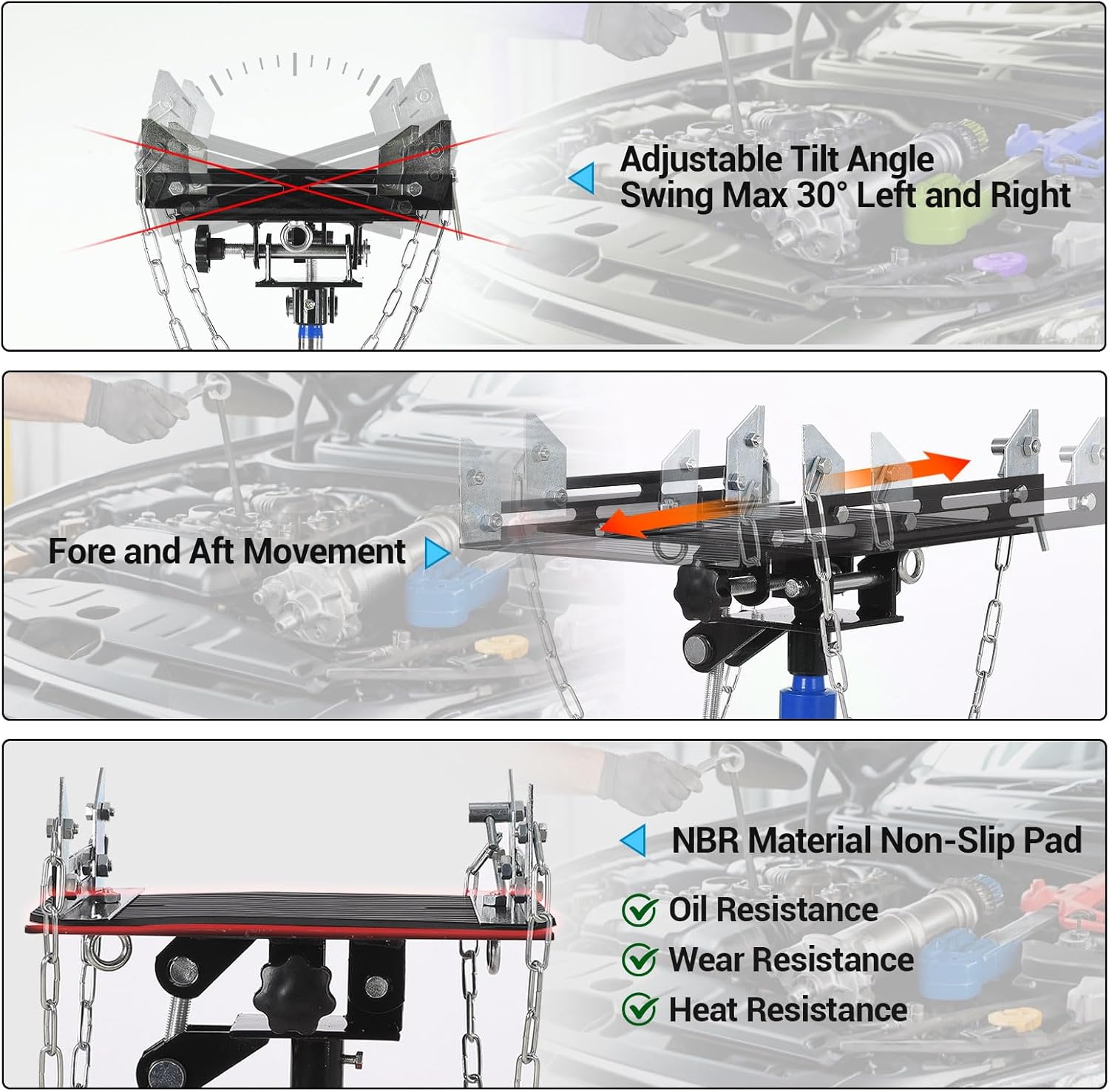- ă1322 LBS Load Capacityă- This hydraulic transmission jack is engineered from robust carbon steel, ensuring exceptional durability and strength, and maximum load capacity is up to 1322lbs. Its wide base provides enhanced stability, while the two heavy-duty safety anchor chains securely hold the load in place, allowing for safe and efficient transmission service. In addition, it comes with an 8MM thick anti-slip pad to ensure safe load.