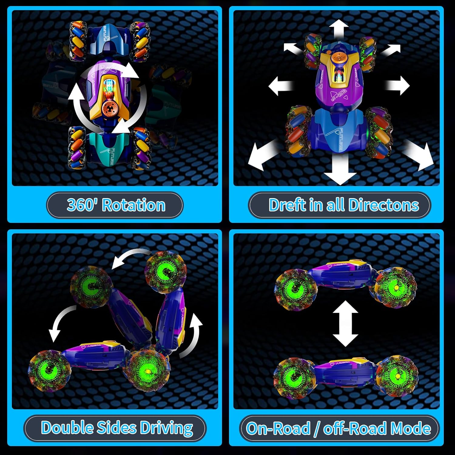 - 360-Multiple Stunts:awesome stunts such as Drifting all direction, moving sideways, and revolving 360 degrees…Forward/backward,turn right/left, right/left drift, extreme 360 rolling, double-sided 4WD driving, transform mode,Whether playing indoors or outdoors, It’s a thrilling way for kids to explore physics and mechanics,will keep them captivated for hours,Very cool kids toys boys 6-8-12
