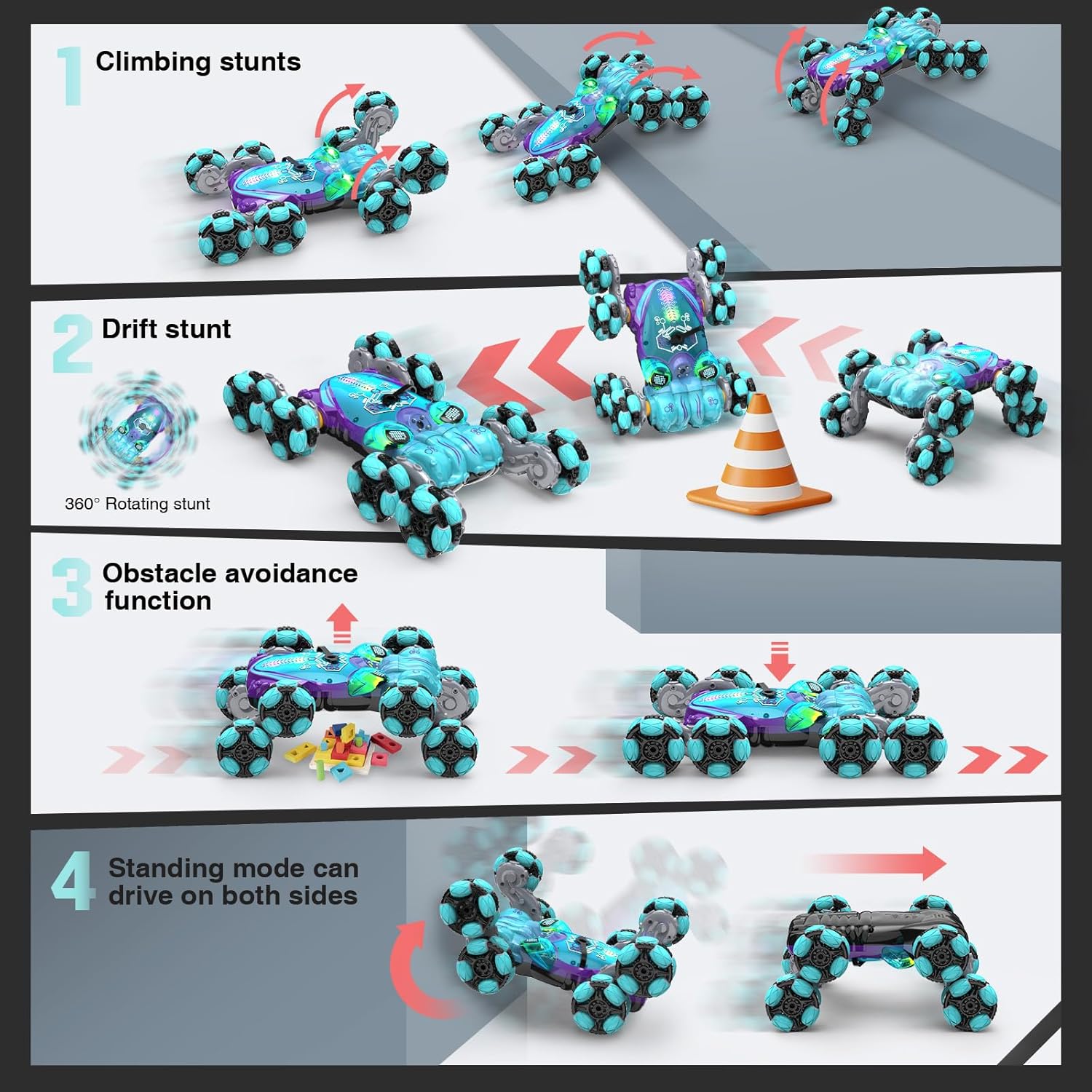 - 8WD Gesture Sensing RC Car: Experience awesome stunt with Paaxido 8WD RC car, 360° rotation, circle, drift, crawl, and double-sided driving, equipped with 4 pairs of swinging arms which allows elude the obstacle and climb stairs with ease
