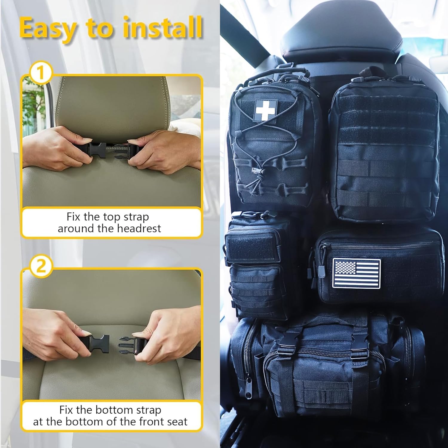 - đźš— Easy Installation - With adjustable strap,easily adjust to fit around your headrest and at the bottom between the seat back and base.Each Molle bags has been designed with velcro tape and buckle, each pouch is flexible to be added or removed.