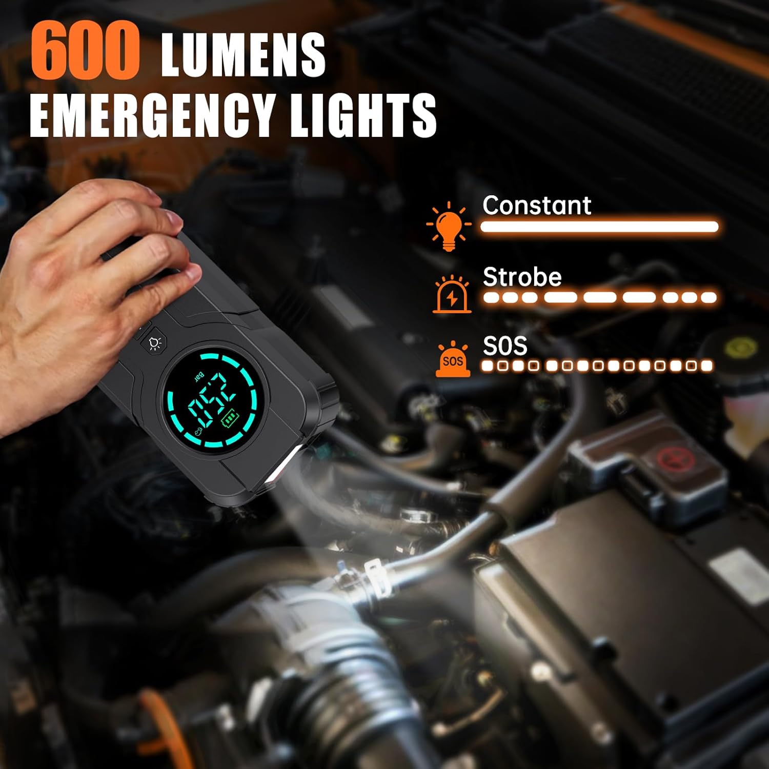 - â€ăFast Tire Inflation and LCD ScreenăThis Car Jump Starter features a clear, easy-to-read LCD screen and delivers up to 150 PSI. Equipped with 4 multi-function nozzles, it's perfect for cars, motorcycles, bikes and sports equipment. Keeps you ready for any tire emergency. Press the jump starter light button can switch 3 LED light modes (Flashlight, SOS, Strobe), perfect for nighttime emergencies, also dual Type-C ports for charging mobile devices.