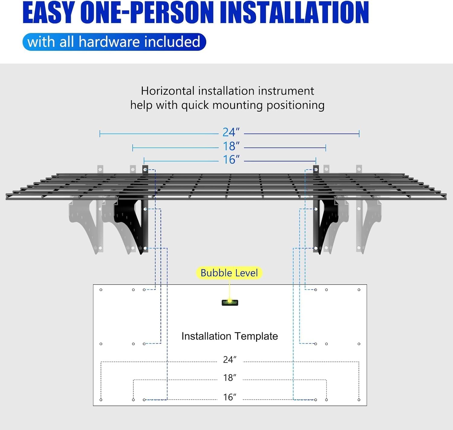 - EASY INSTALLATION: Easy one-person installation with all hardware included: mounting template to help with mounting holes; bubble level to help get a perfectly level position for fast, safe installation of garage ledges in any mounting condition