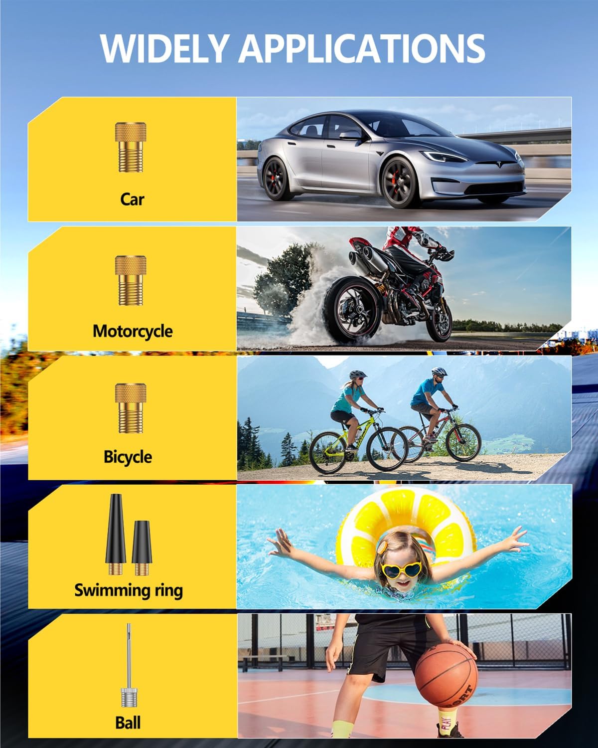 - 【Wide Application】This tire air pump is great for cars, SUVs, lawnmower,motorcycles and bike tires and the general adapter works well for swim rings, cushions, air pillows, etc. Note: Not suitable for high-volume items like air mattresses or heavy-duty tires.