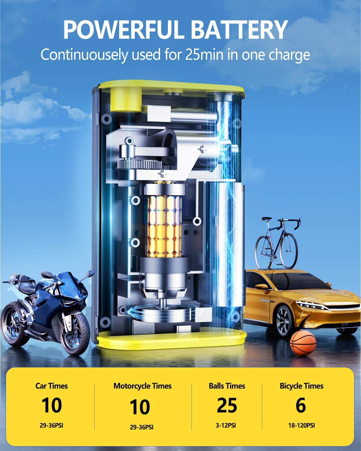 GEARGO Portable Tire Inflator Air Compressor 150PSI Cordless Air Pump for Car, Motorcycle, Bicycle Tires, Balls, 3X Faster Auto Smart Air Pump with Digital Pressure Gauge, LED Light, Black Yellow