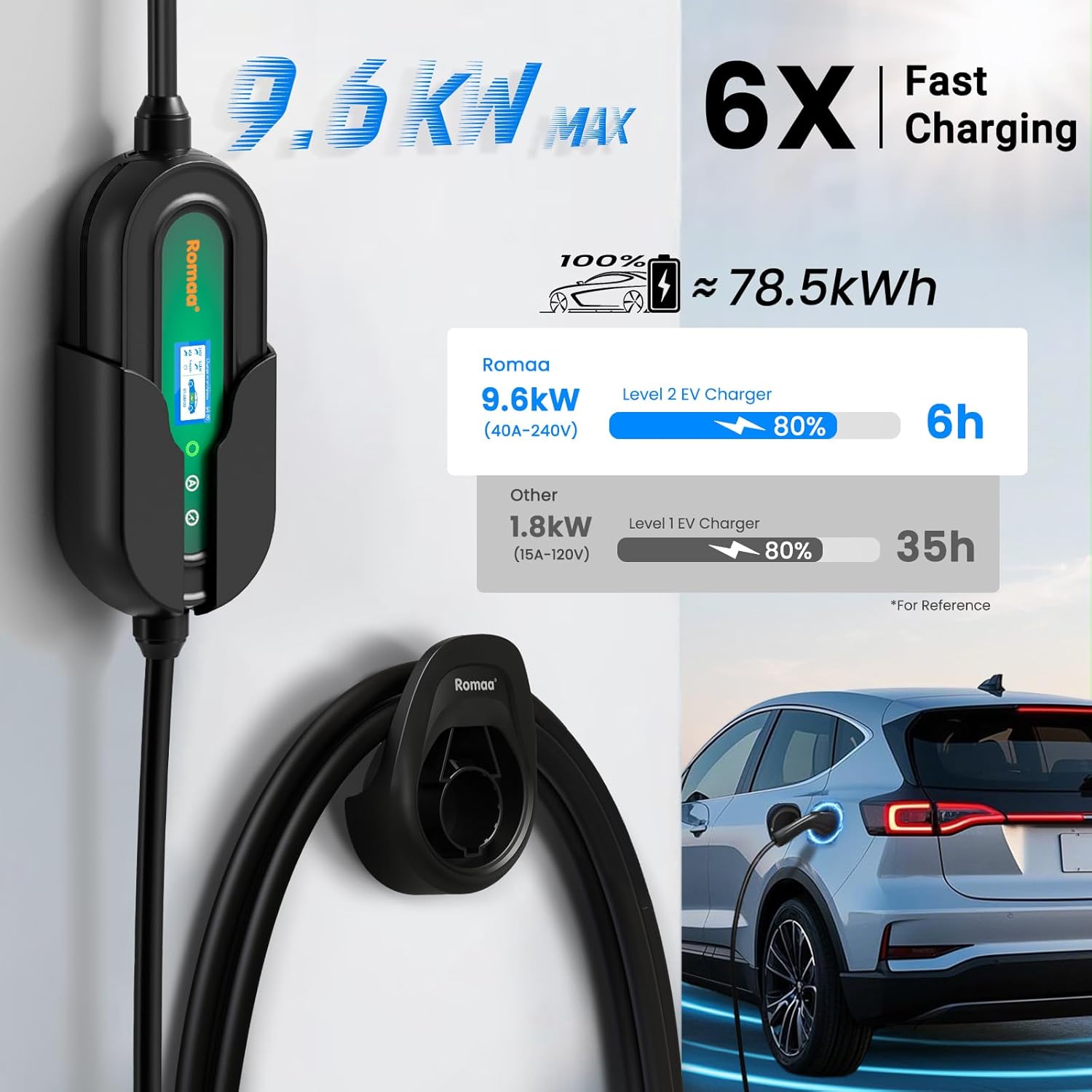 - Charging Power & Flexibility: Level 2 EV Charger, 40A output with NEMA 14-50 plug (requires 50A breaker), Supports 240V, max 9.6kW (medium speed, 4–8hrs full charge), Ideal for daily commuters or faster needs.Includes NEMA 14-50 to 5-15 Adapter: Converts to Level 1 EV charging (slower speed), Current may drop to 12A, delivering 1.32–1.8kW (110V×12A to 120V×15A)