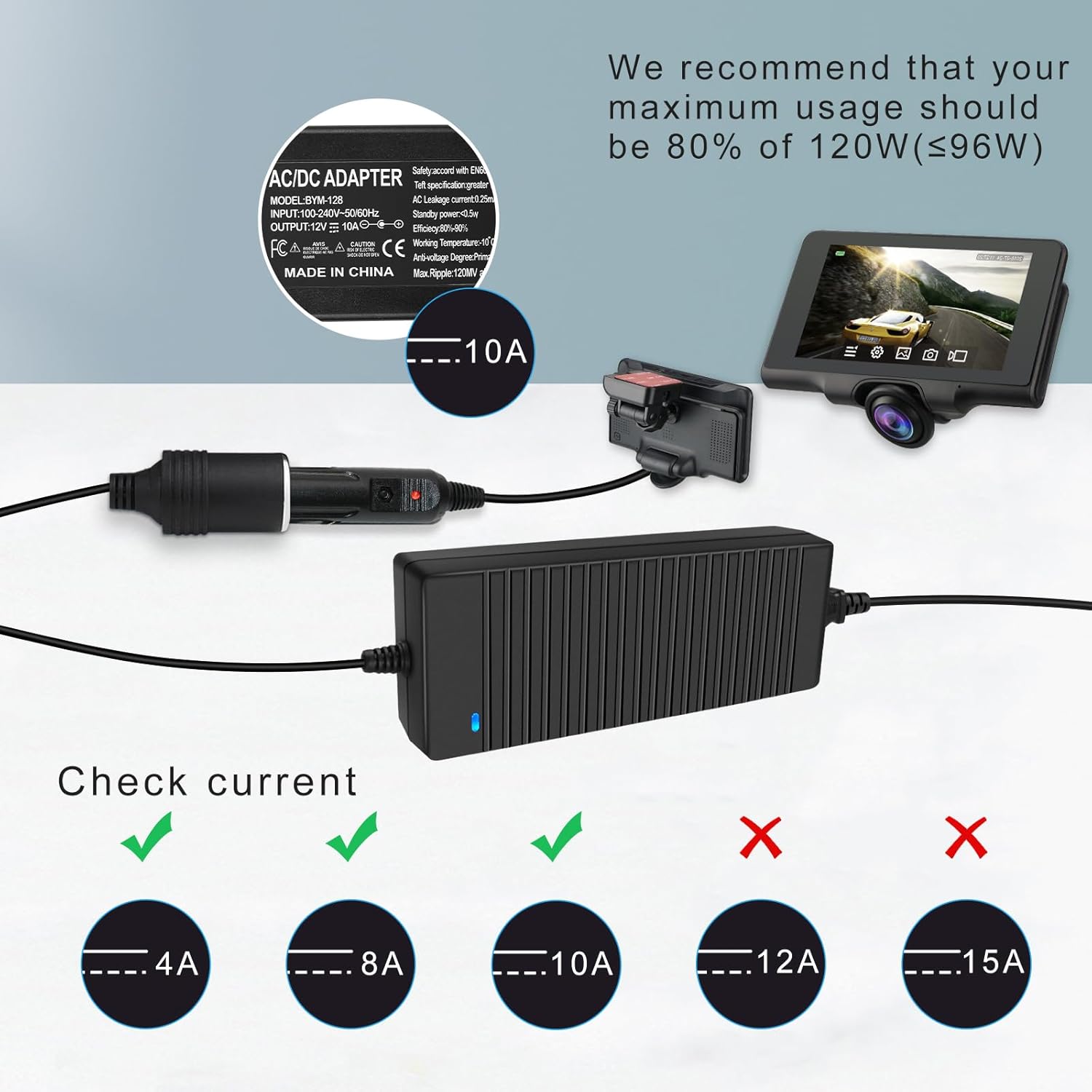 - Input : 100-240V AC; Output: 12V DC 10A 120W; Standard U.S. 2-pin plug and female car lighter connecter. Suggestion: Use no more than 80% of the 12v driver's capacity; Please check if your device's is a standard male car cigarette lighter plug before use