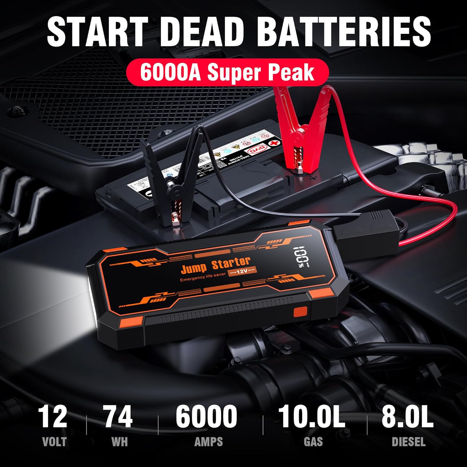 - ă6000A Car Jump Starteră With 6000A high peak current and upgraded reinforced smart clamps, the car battery pack super fast jump start a dead battery in seconds even at -4~140â and make your car get back on the road quickly and safely. Never anxiously wait hours for roadside assistance again.