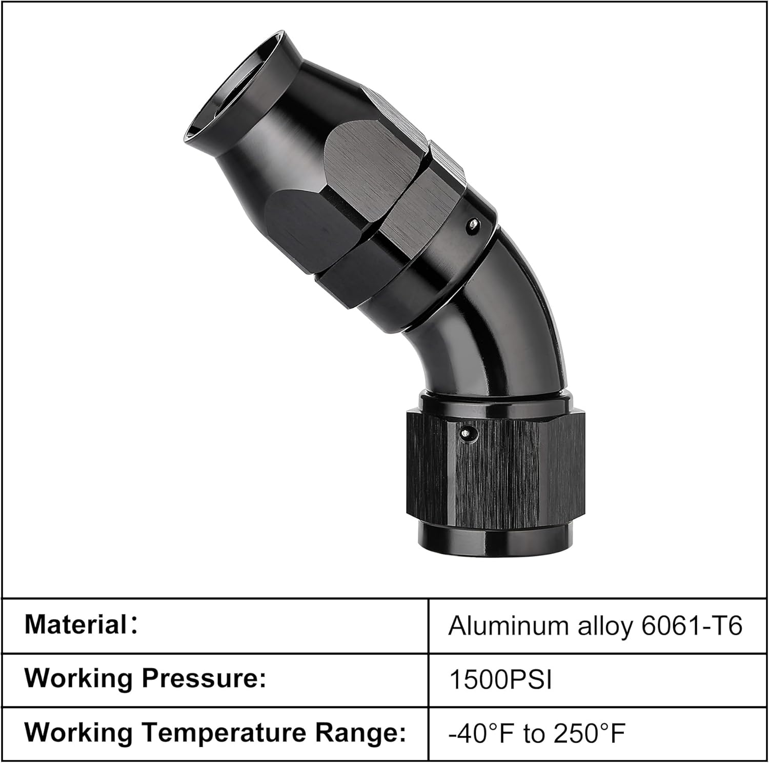 - [Built to Last] The one-piece PTFE hose end fitting is made from lightweight 6061-T6 aluminum alloy, and a black anodized finish on the surface increases durability, anti-corrosion, and wear resistance.