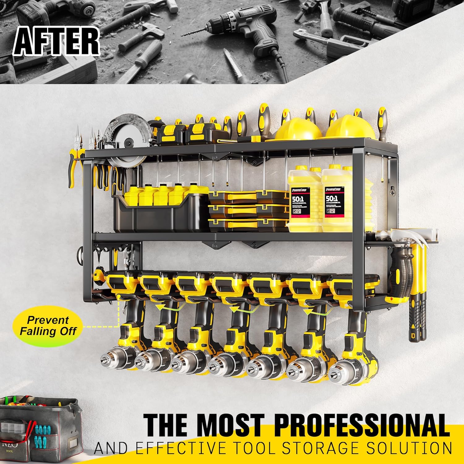 - Heavy Duty Steel Construction: The power tool organizer is constructed from a high quality powder-coated alloy steel, Its sleek black finish prevents scratching, that is rust-resistant, corrosion-resistant, and scratch-resistant.