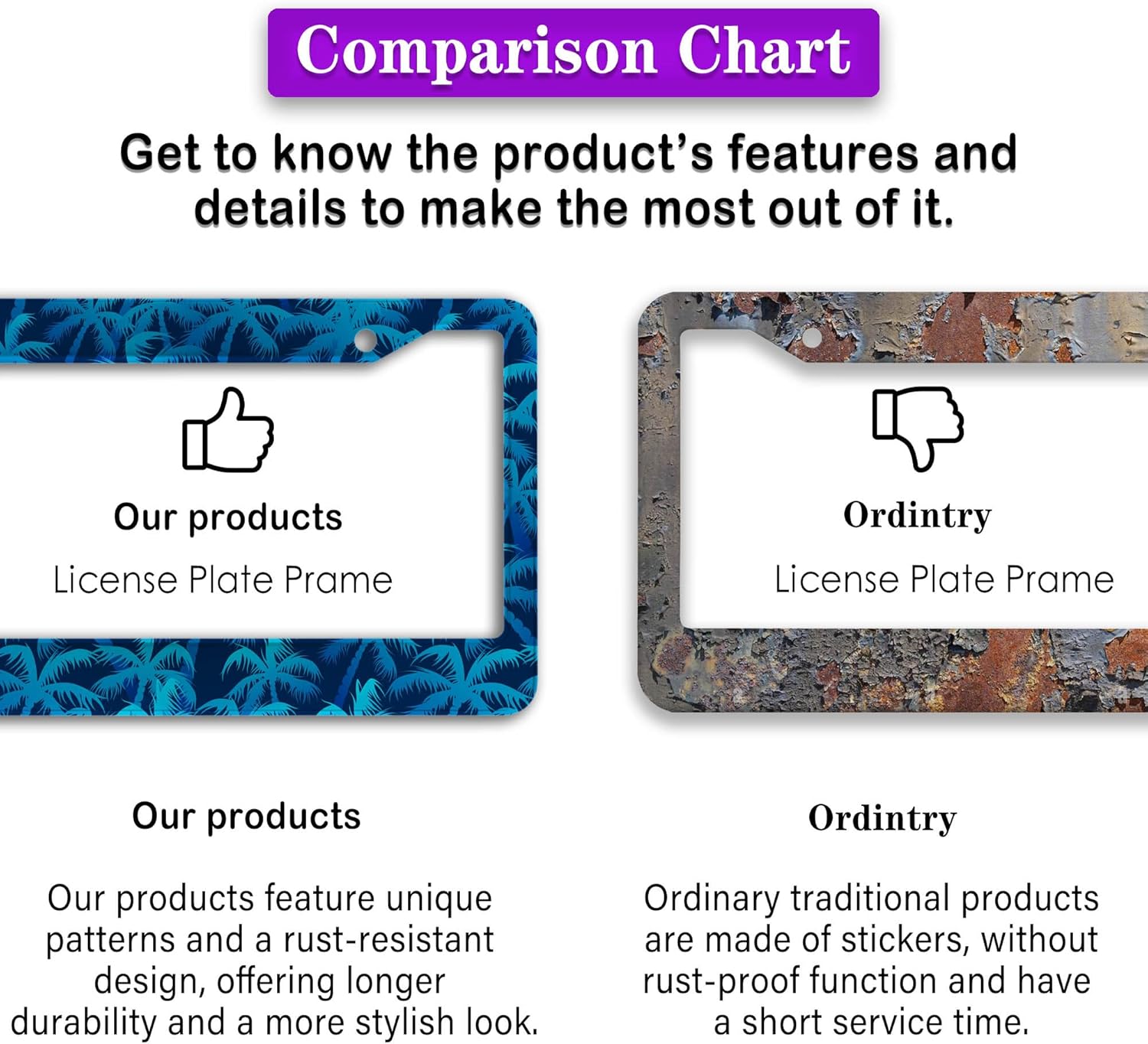 - ALUMINUM FRAME: This License Plate Frame is crafted from high-quality aluminum that is resistant to corrosion, rust, and harsh weather conditions. Its rugged reliability design ensures a long lifespan, making it capable of withstanding car washes and extreme weather, providing you with a reliable and stylish solution for your vehicle.